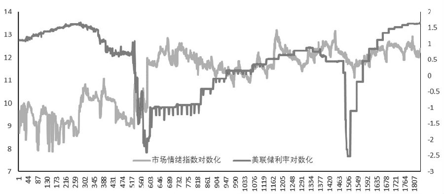 图5为市场情绪价值指数与美联储利率对数化走势 本文根据构建的市场情绪价值指数模型做出市场情绪指数与美联储利率对数化走势,如图5所示,能较为有效地拟合出市场情绪对于美联储调息的变化。考虑到棉花价格受到当年度供求关系影响,因此加入供求因子(V),与市场情绪价值指数共同判断美联储调息周期对棉价走势的影响。由表7可知,在加入了市场情绪价值指数及供需因子后,对郑棉期价的解释能力得到了明显的增强。在第3期各因子解释力度出现较为明显的增长,随后解释力度逐步趋于平稳。这表明,美联储加息周期除通过自身的利率变动对价格产生影响外,更多地是通过市场情绪间接地对价格产生影响。