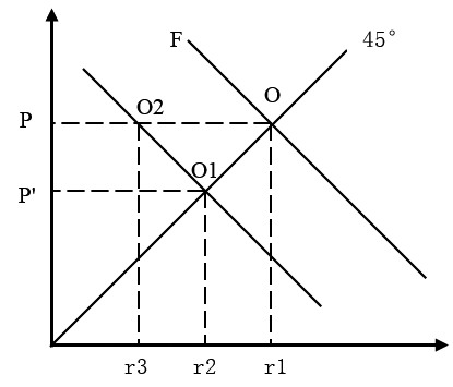 图1为郑棉主力合约上市以来收盘价与美元调息周期划分 [理论基础] 蒙代尔-弗莱明-多恩布什模型(M-F-D模型)在继承蒙代尔-弗莱明模型的基础上,引入了理性预期和汇率超调两个新假设,这一模型在国际货币政策研究领域具有深远的理论与实践价值。该模型沿用蒙代尔-弗莱明模型的前提,即资本在国际市场上具有完全的流动性。 假设利率传导机制只在中美两国之间发生作用。在美联储提高利率之后,市场预期美元将增值而人民币将回落,资本自由流动的假设导致汇率立即发生变动。然而,商品市场的调整速度不及资本市场,这导致汇率随后出现回调。如图2所示,F线代表货币市场的均衡状态,汇率与价格水平呈反向关系,45°线表示汇率与价格水平在长期均衡状态下的购买力平价曲线。初始均衡点为O点,由于外国加息和经济紧缩的影响,商品市场和货币市场都需要进行调整,以达到新的均衡点O1。但由于资本的完全流动性,汇率会立即发生变化,而商品价格的调整则较为缓慢,因此首先达到的是与O1点平行、价格水平保持不变的短期平衡点O2。随后,随着商品市场价格的逐步调整,价格从P点缓慢调整至P',汇率从r2点调整至r3,最终达到新的均衡状态。在此过程中,可以观察到汇率出现了超调现象,汇率下降的幅度r1至r2超过了实际均衡汇率的变动r1至r3。