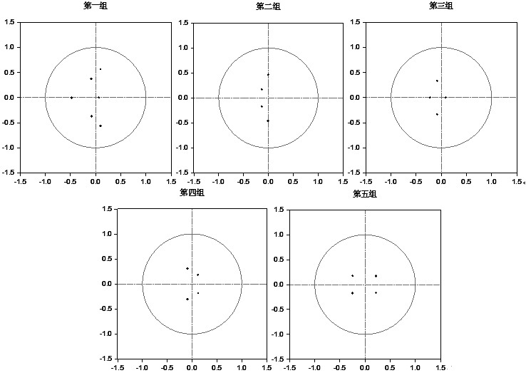 表2为ADF检验结果 由表2可知,经一阶差分后处理的5组数据均通过ADF检验,表明数据不存在单位根,即证明数据是平稳的,不具备随机漂移的特征,故可以建立VAR模型(见图3)。根据ACI与SC最小判断准则,我们在第1组中选择模型滞后3期,第2至5组滞后2期,所有点均落在单位圆内,如图2所示,故认为建立的VAR模型是稳定的。