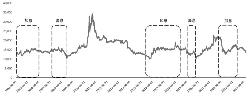 表1为21世纪以来美联储调息周期及利率变化 国内郑棉期货合约于2004年6月上市,共经历美联储3个完整的加息周期以及2个降息周期。从图1我们可以看出,在第1次与第2次加息周期内,郑棉价格走势整体呈现上涨趋势;第3次加息周期中,郑棉价格呈现先跌后涨的特征。在第1次降息周期内,郑棉价格震荡下降,在第2次降息周期内,郑棉价格则略有上涨。在不同的调息周期内,大宗商品的价格走势与调息周期长度、次数以及调息力度都有一定的内在联系。