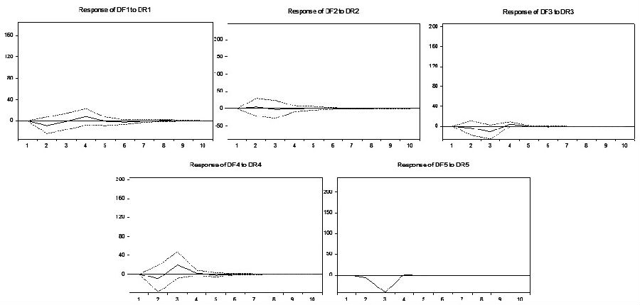图4为脉冲响应示意 同时,我们能通过表3看出,在美联储调息周期开始初期,价格并未达到最大程度的反应,这表明市场需要一定的反应时间。在5组数据中,基本是第3、第4期时美联储调息对价格的解释程度最高,随后解释力度逐步趋于稳定。我们也能从表3中看出,美联储调息周期对价格的解释程度与调息的时间长度和调息的力度密切相关。第5组,美联储在16个月的时间内进行了11次加息,加息幅度为5.25个百分点。相较于其他4次调息,第5次调息时间长度短、幅度大,因此我们能够看到,在第5组中美联储调息对价格的解释力度相对于其他4组更为有力。