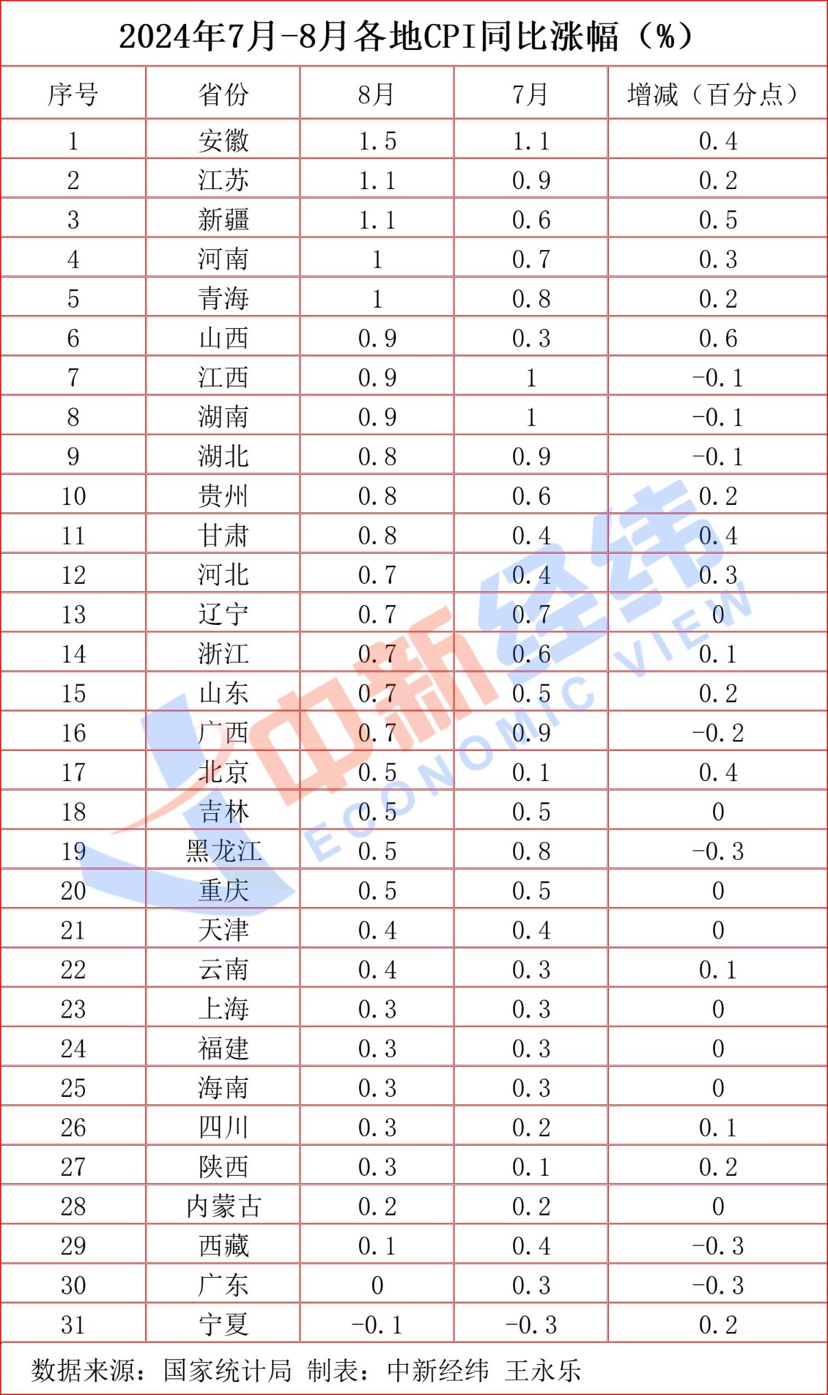 31省份8月CPI出炉:29地上涨 宁夏“六连降”