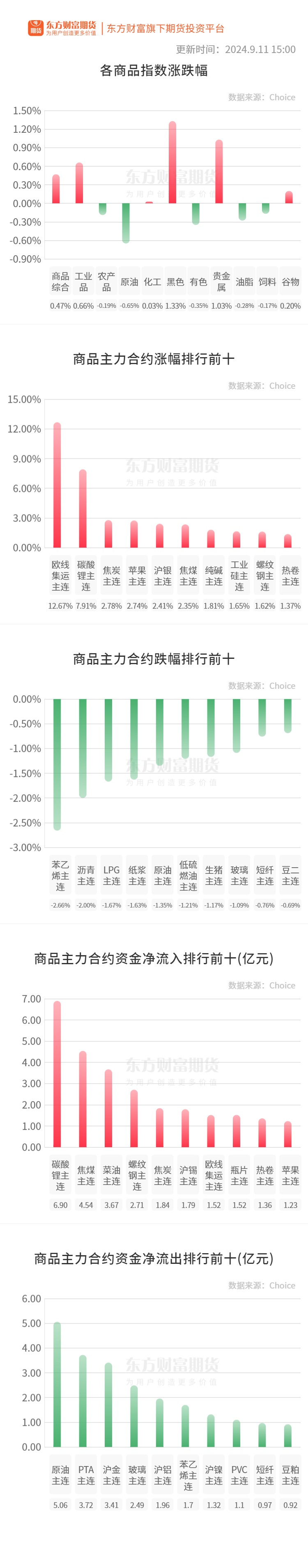 行情纵览![]() 宏观要闻中国证券报:据央行网站消息,为维护银行体系流动性合理充裕,9月11日,人民银行以固定利率、数量招标方式开展了2100亿元逆回购操作。因今日有7亿元7天期逆回购到期,实现净投放2093亿元。 央视新闻:西班牙首相桑切斯今天(11日)结束为期四天的访华行程。在记者会上,被问及西班牙是否会重新考虑在欧盟对华电动汽车加征关税问题上的立场时,他进行了回应。西班牙首相桑切斯表示,事实上,我们需要重新考虑这一决定,不仅是所有欧盟成员国,还有欧盟委员会都应该重新审视。就像我之前说的,我们不需要另一场贸易战。 品种资讯黑色系期货 钢材:截至9月11日当周,找钢网库存分析:①建材产量300.15万吨,周环比增19.84万吨,升7.08%;年同比减32.21万吨,降9.69%。②建材厂库246.35万吨,周环比减0.07万吨,降0.03%;年同比减45.76万吨,降15.67%。③建材社库364.74万吨,周环比减33.54万吨,降8.42%;年同比减137.81万吨,降27.42%。④建材表需333.76万吨,周环比减1.69万吨。(找钢网) 煤炭:本周Mysteel统计全国110家洗煤厂样本,开工率68.20%较上期降0.40%;日均产量57.28万吨降0.74万吨;原煤库存286.18万吨增7.79万吨;精煤库存189.95万吨增6.26万吨。(Mysteel) 农产品期货 生猪:截至9月11日14:00时,全国农产品批发市场猪肉平均价格为27.15元/公斤,较前一日上升0.9%。(农业农村部) 截至9月4日,全国生猪出场价格为20.21元/公斤,比8月28日下跌0.3%;主要批发市场玉米价格为2.42元/公斤,较8月28日持平;猪粮比价为8.35,比8月28日下跌0.36%。(国家发改委网站) 棉花:国际棉花咨询委员会(ICAC)发布的数据显示,全球2024/2025年度棉花产量预估为2562.04万吨,同比增加6.2%,2023/2024年度产量预估为2412.30万吨。全球2024/2025年度棉花期末库存预估为1834.29万吨,同比减少1.2%,2023/2024年度期末库存预估为1856.27万吨。(新华财经) 有色/贵金属期货 碳酸锂:上海钢联发布数据显示,9月11日电池级碳酸锂价格较上日上涨1000元,均价报7.35万元/吨。(财联社) 9月11日下午,雅保公司电池级碳酸锂竞标活动结束。本次为吉诚锂业所产200吨碳酸锂招标,中标价格为75008元/吨,招标结束后国内自提。(上海有色网) 工业硅:截至9月10日,黄埔港工业硅421#价格12100-12300元/吨,较上周持稳。整体来看,供应端小幅减产,下游需求未有明显好转迹象,市场去库缓慢,供需基本面延续宽松。下游市场压价情绪仍在,但部分厂家低价出货意愿较弱。(卓创资讯) 能化期货 甲醇:截至2024年9月11日,中国甲醇港口库存总量在116.83万吨,较上一期数据减少0.61万吨。其中,华东地区累库,库存增加1.65万吨;华南地区去库,库存减少2.26万吨。(隆众资讯) 原油:EIA月度短期能源展望报告显示,预计2024年全球石油需求为1.031亿桶/日,此前预期为1.029亿桶/日;预计2025年需求为1.046亿桶/日,此前预期为1.045亿桶/日。(财联社) 尿素:9月11日尿素行情继续下行,部分主流地区报价下调10-30元/吨左右。(农时达情报) 晚间关注20:30 美国:非季调CPI当月同比;美国:非季调核心CPI当月同比 (文章来源:东方财富研究中心) (责任编辑:迷你学人) |