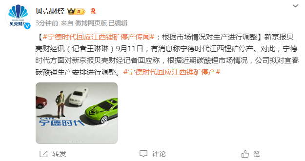 宁德时代回应江西锂矿停产传闻:根据市场情况对生产进行调整