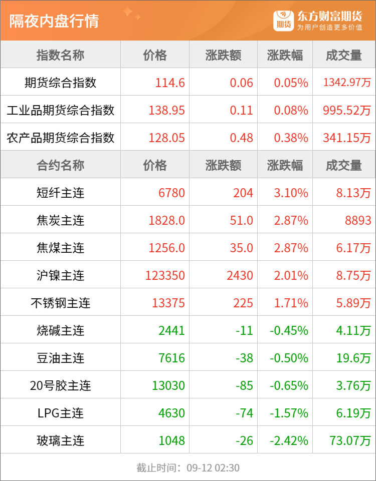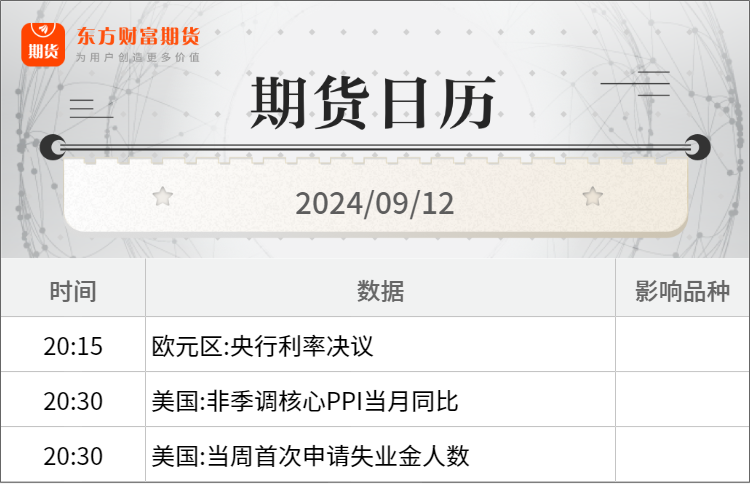 隔夜行情![]() ![]() 每日精选宁德时代回应江西锂矿停产传闻:根据市场情况对生产进行调整 比金融危机、新冠疫情时更糟!图解:油市崩到了何种程度? 棕榈油产地8月供强需弱、影响中性偏空 但符合市场预期 宏观产经央视新闻:从证监会获悉,在多项政策支持下,我国资本市场并购重组正进入“活跃期”。数据显示,2024年5月以来,A股上市公司共披露46单重大资产重组项目,7单发股类重组提交证监会注册。证监会有关部门负责人表示,总体看,并购重组市场化改革取得了积极成效,具有标志性意义的并购案例相继涌现,呈现“硬科技”企业并购较为活跃,助力技术创新与资源整合的特点。 财联社:美国8月CPI同比上升2.5%,连续第5个月回落,预估为2.5%,前值为2.9%;美国8月CPI环比上升0.2%,预估为0.2%,前值为0.2%。美国8月份核心CPI同比上升3.2%,市场预估上升3.2%。 央视新闻:西班牙首相桑切斯11日结束为期四天的访华行程。在记者会上,被问及西班牙是否会重新考虑在欧盟对华电动汽车加征关税问题上的立场时,他进行了回应。西班牙首相桑切斯表示,事实上,我们需要重新考虑这一决定,不仅是所有欧盟成员国,还有欧盟委员会都应该重新审视。就像我之前说的,我们不需要另一场贸易战。 品种资讯黑色系期货 钢材:9月11日全国旧标螺纹钢市场库存占比17.63%,日环比降幅1.59%,从七大区域来看,东北占比9.61%,降幅1.70%,华北占比13.70%,降幅1.66%,华东占比19.68%,降幅1.13%,华南占比17.05%,降幅1.27%,华中占比20.86%,降幅1.93%,西北占比15.62%,降幅2.94%,西南占比20.26%,降幅1.33%。 本周唐山主流样本钢厂平均钢坯含税成本3055元/吨,周环比下调46元/吨,与9月11日普方坯出厂价格2830元/吨相比,钢厂平均亏损225元/吨。(Mysteel) 锰硅:巴西海关数据显示,2024年8月巴西锰矿出口总量2.84万吨,环比减少26.09%,同比减少72.21%。其中出口至中国的锰矿2.01万吨,环比减少15.34%,同比减少71.37%。(Mysteel) 煤炭:本周Mysteel统计全国110家洗煤厂样本,开工率68.20%较上期降0.40%;日均产量57.28万吨降0.74万吨;原煤库存286.18万吨增7.79万吨;精煤库存189.95万吨增6.26万吨。(Mysteel) 农产品期货 生猪:截至9月11日14:00时,全国农产品批发市场猪肉平均价格为27.15元/公斤,较前一日上升0.9%。(农业农村部) 截至9月4日,全国生猪出场价格为20.21元/公斤,比8月28日下跌0.3%;主要批发市场玉米价格为2.42元/公斤,较8月28日持平;猪粮比价为8.35,比8月28日下跌0.36%。(国家发改委网站) 棉花:国际棉花咨询委员会(ICAC)发布的数据显示,全球2024/2025年度棉花产量预估为2562.04万吨,同比增加6.2%,2023/2024年度产量预估为2412.30万吨。全球2024/2025年度棉花期末库存预估为1834.29万吨,同比减少1.2%,2023/2024年度期末库存预估为1856.27万吨。(新华财经) 有色/贵金属期货 碳酸锂:上海钢联发布数据显示,9月11日电池级碳酸锂价格较上日上涨1000元,均价报7.35万元/吨。(财联社) 9月11日下午,雅保公司电池级碳酸锂竞标活动结束。本次为吉诚锂业所产200吨碳酸锂招标,中标价格为75008元/吨,招标结束后国内自提。(上海有色网) 工业硅:截至9月10日,黄埔港工业硅421#价格12100-12300元/吨,较上周持稳。整体来看,供应端小幅减产,下游需求未有明显好转迹象,市场去库缓慢,供需基本面延续宽松。下游市场压价情绪仍在,但部分厂家低价出货意愿较弱。(卓创资讯) 能化期货 原油:花旗集团表示,油价跌至两年多以来的最低水平表明,市场在向OPEC+表示不需要增加供应。全球基准的布伦特原油周二跌破每桶70美元,为2021年12月以来首次。在非OPEC+供应大量增加的情况下,如果想要平衡市场,该集团明年可能需要减产。 EIA月度短期能源展望报告显示,预计2024年全球石油需求为1.031亿桶/日,此前预期为1.029亿桶/日;预计2025年需求为1.046亿桶/日,此前预期为1.045亿桶/日。(财联社) 甲醇:截至2024年9月11日,中国甲醇港口库存总量在116.83万吨,较上一期数据减少0.61万吨。其中,华东地区累库,库存增加1.65万吨;华南地区去库,库存减少2.26万吨。(隆众资讯) 尿素:9月11日尿素行情继续下行,部分主流地区报价下调10-30元/吨左右。(农时达情报) 环球视野财联社:花旗预测美联储9月份降息25个基点,11月和12月分别降息50个基点。 财联社:交易员预计美联储将下周降息25个基点,并预计今年总共将降息100个基点。 每日关注![]() (文章来源:东方财富研究中心) (责任编辑:迷你学人) |