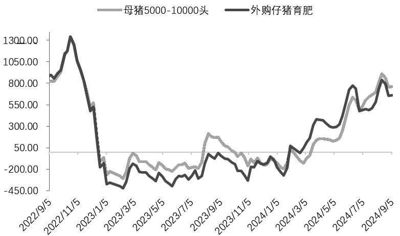 图为全国外三元生猪价格(元/公斤) [扩产能意愿不足] 养殖端的盈利和亏损将直接或间接影响母猪产能的增减,当有较为客观且一定持续性的盈利时,养殖端能繁母猪存栏会增加,相反盈利不足或者亏损会加速能繁母猪的去化。 从2024年开始,生猪价格持续回暖。相关数据显示,截至9月10日,全国外三元生猪出栏均价为19.57元/公斤(最低价格为1月13日的13.35元/公斤,最高价格为8月15日的21.17元/公斤)。外购仔猪育肥模式的养殖利润自2024年2月29日开始扭亏为盈,自繁自养模式的生猪养殖利润自2024年3月21日开始扭亏为盈。