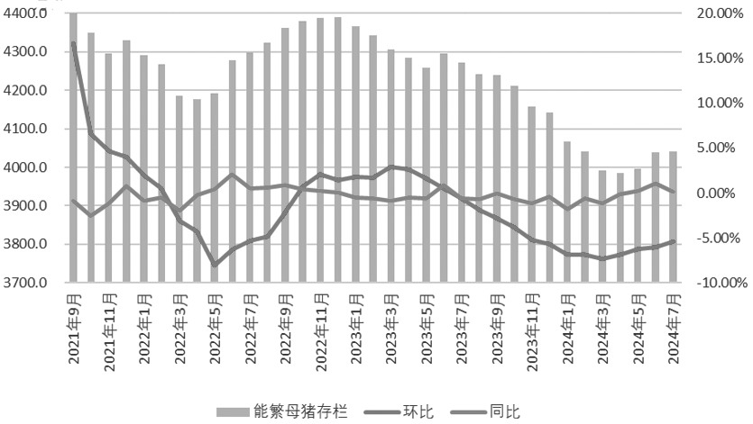 图为生猪养殖利润(元/头) 据农业农村部数据,全国能繁母猪存栏自2024年5月开始环比回正。截至2024年7月,全国能繁母猪存栏4041万头,月环比增长0.1%,同比下滑5.40%,累计增幅1.38%,月平均增幅0.46%。