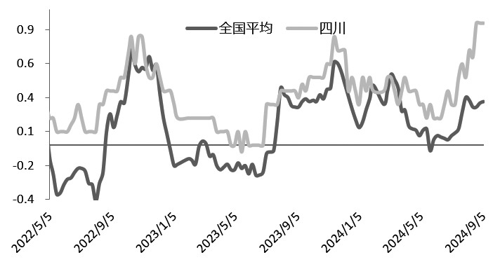 图为生猪出栏均重(公斤/头) 造成生猪出栏体重居高不下的主要原因如下: 首先,饲料价格不断下行,养殖成本越来越低。根据涌益咨询的数据,自2023年9月中下旬开始,饲料价格呈持续下行趋势,从3739元/吨降至目前的3219元/吨,降幅13.91%。5000~10000头母猪存栏规模养殖主体当期出栏养殖成本从15.92元/公斤降至目前的13.74元/公斤,降幅13.69%。外购仔猪育肥成本从17.20元/公斤附近降至3月底的12.07元/公斤,之后仔猪价格上涨,外购仔猪育肥成本再次上调,截至2024年8月29日,外购仔猪育肥成本为14.56元/公斤。 其次,高肥标价差支撑压栏情绪。根据涌益咨询的数据,截至9月5日当周,肥标价差为0.32元/斤,其中四川地区肥标价差0.90元/斤。受去年生猪疫病影响,中小散户及规模化养殖集团产能去化出现差异,部分区域中小散户产能去化率在80%以上。而养殖群体结构的改变,会直接导致生猪市场肥猪及标猪占比的改变。具体看,受规模化养殖条件以及仔猪商品猪进出栏排期影响,规模集团场生猪出栏均重上限受限,单就栏舍来说上限约为128公斤/头,若考虑进出栏排期,出栏均重或更低。所以今年生猪市场大猪存栏量有限,肥标价差基本维持正值,且夏季肥标价差未出现明显倒挂现象。