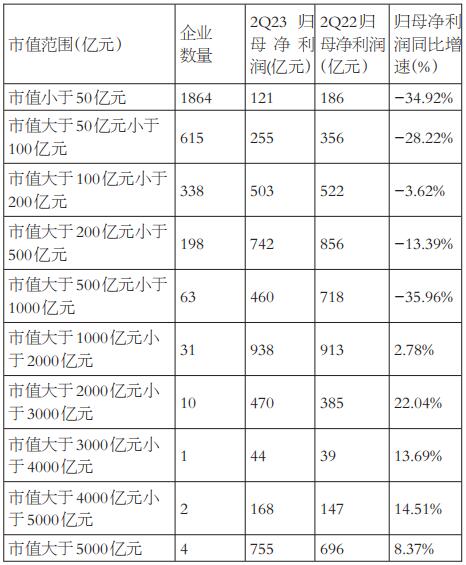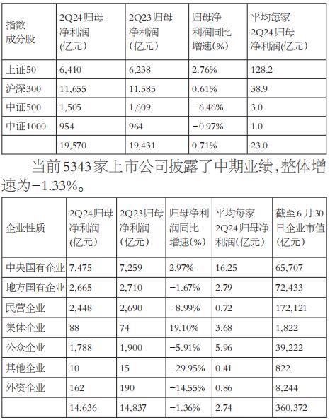 从四大指数来看,已披露的沪深300指数成分股同比增速为2.76%,已披露的上证50指数成分股整体上取得了0.61%的同比增速,已披露的中证500指数成分股取得了-6.45%的同比增速,已披露的中证1000指数成分股取得了-0.97%的同比增速。 按企业性质来看,二季度中央国有企业和集体企业业绩保持较快的增长。按市值来看,1000亿元以上的上市公司整体业绩表现较好,同比增速为正。 按细分行业来看,汽车和非银金融二季度业绩领跑其他行业;而房地产、农林牧渔等行业业绩表现不佳;科技板块方面,通信和电子板块业绩向好。消费方面,食品饮料业绩增速在10%以上。