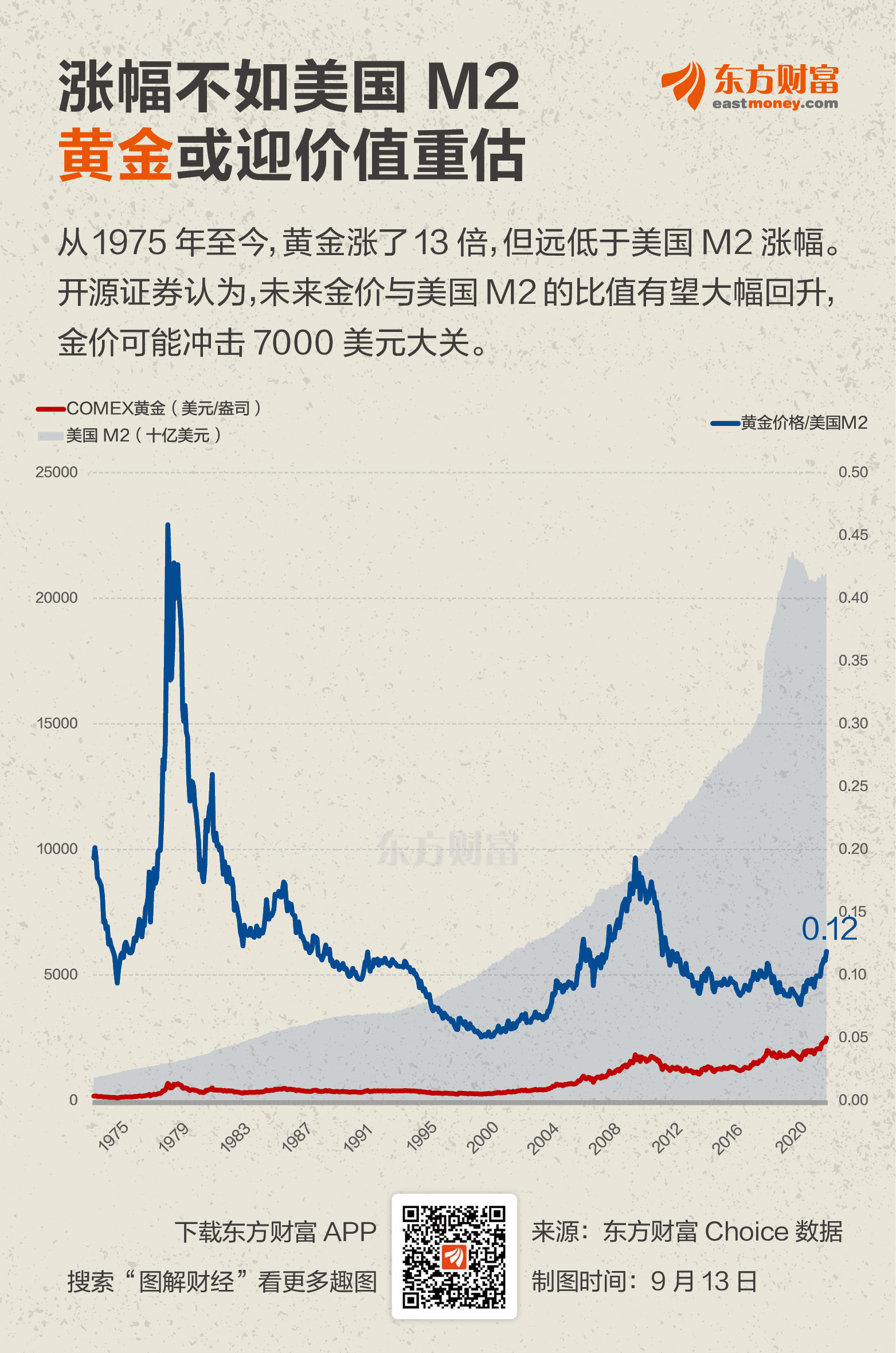 ![]() 9月13日,金价继续冲高,COMEX黄金主力合约盘中首次突破2600美元大关,再创历史新高。 开源证券表示,讨论黄金价格,可以分为利率框架和信用框架。短期,黄金跟随利率框架,中长期,黄金跟随信用框架。在利率框架下,9月美联储超预期降息50BP的可能性较低,降息25BP更多验证经济韧性,从利率框架分析对黄金的催化有限,黄金向上空间有限。 但在信用框架下,黄金上涨远未结束。开源证券指出,黄金当前处于狂热期,公众逐渐意识到配置黄金的重要性,黄金是纸币的信用背书,伴随着美国货币超发,黄金将重新迎来价值重估。 从有数据以来的1975年至今,COMEX黄金期货价格上涨了13倍,而同期美国货币供应量(M2)增加了22倍,黄金价格(单位:美元/盎司)与美国M2(单位:10亿美元)的比值目前约为0.12。 开源证券认为,未来伴随着美国经济衰退或许会迎来美元信用重置,参照1970-1980年黄金牛市中黄金/美国M2的比值(1974年底为0.2,1980年初曾达到0.46高点),第一阶段,黄金/美国M2或许来到0.17;第二阶段,黄金/美国M2或许来到0.37。 如果黄金/美国M2比值真能达到1970-1980年黄金牛市的水平,开源证券认为:“本轮黄金牛市价格将有望冲击7000美元/盎司。” (文章来源:东方财富研究中心) (责任编辑:迷你学人) |