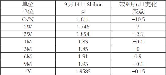 随着节日资金需求的释放,国内资金利率整体处于回落态势。截至9月14日,上海银行间同业拆放利率(Shibor)隔夜、2周期、1月期、9月期、1年期利率分别报收于1.611%、1.854%、1.83%、1.93%、1.9585%,较9月6日分别回落10.5、2.6、0.1、0.1、0.15个基点;1周期、6月期利率分别报收于1.746%、1.91%,较9月6日分别回升7、0.9个基点;3月期利率报收于1.85%,与9月6日持平。