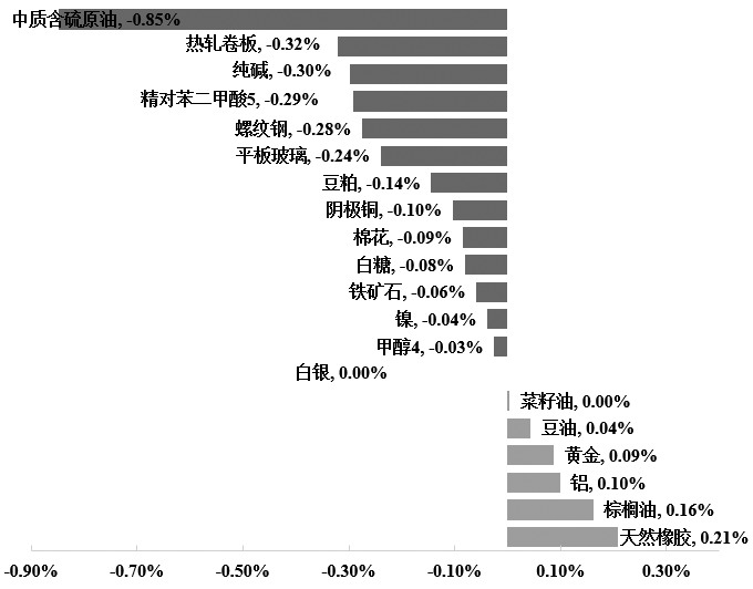 图为中证商品期货指数走势 二是从品种维度看,对中证商品期货指数收益率绝对值贡献度最大的5个品种依次为:中质含硫原油、热轧卷板、纯碱、精对苯二甲酸及螺纹钢,分别从属于能源化工及黑色金属板块。 原油方面,原油需求远景预期较弱,三大机构均下调了全球原油需求增速。供应端增产预期较强,OPEC+成员国曾计划今年四季度启动增产,其中包括从10月起将逐月增加产量18万桶/天。 热轧卷板方面,受益于出口需求强劲,过去相当长一段时间内热轧卷板维持高供应、高需求格局。8月,钢厂处于降负荷周期,热轧卷板减产幅度相对较小,同时海外反倾销对热卷出口的利空导致热卷库存压力持续显现。 纯碱方面,需求疲弱导致纯碱累库压力较大,估值重心下移。疲弱的地产需求下,浮法玻璃冷修预期不断提升,且光伏玻璃供应量降幅较大。