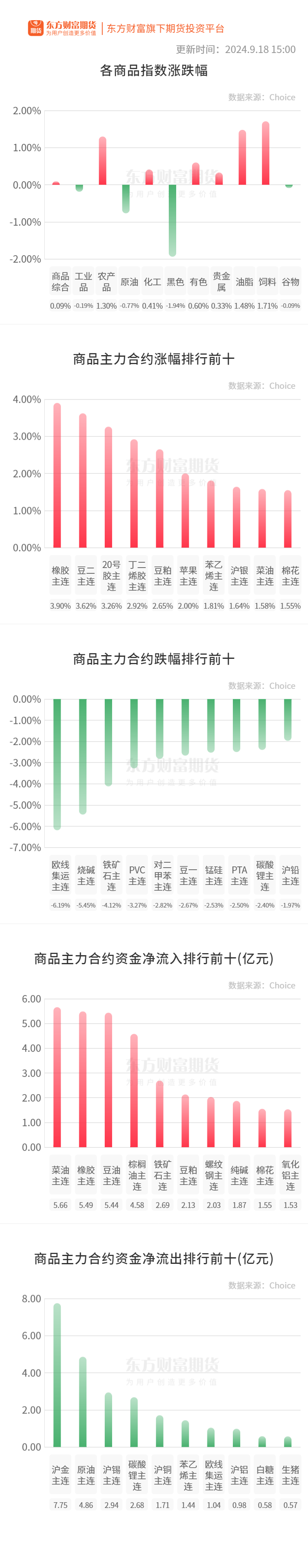 行情纵览![]() 宏观产经新华财经:国家发展改革委向社会公开征求《国有粮油仓储物流设施保护办法(公开征求意见稿)》的意见。此次公开征求意见的时间为2024年9月18日至2024年10月17日。 财联社:当地时间周二,也是美联储利率决议发布前夕,蒂米劳斯再度发文称,美联储本周肯定会降息,但此次降息幅度是更大的50个基点还是传统的25个基点,目前仍无法确定,悬念留到了最后一刻,需要鲍威尔和他的同事们仔细权衡。 财联社:央行今日进行5682亿元7天期逆回购操作,中标利率为1.70%,与此前持平。今日到期的MLF将于9月25日续做。 品种资讯黑色系期货 钢材:上周钢材市场强势反弹,截至9月14日螺纹钢均价报3377元/吨,一周累涨138元/吨。下游终端在中秋节前集中补库之后,近日需求又现平淡,高价资源成交不佳。在经济增长放缓的的大背景下,“金九”需求回暖力度或不大。同时,钢厂对原燃料采购积极性一般,焦炭首轮提涨暂难落地,铁矿石价格继续低位运行。(我的钢铁网) 焦炭:9月18日石家庄地区部分钢厂计划对湿熄焦炭上调50元/吨、干熄焦炭上调55元/吨,2024年9月19日零点执行。(我的钢铁网) 农产品期货 菜油:截止至2024年9月14日(第37周),华东地区主要油厂菜油商业库存约28.43万吨,环比上周增加0.32万吨,环比增加1.14%。(我的钢铁网) 生猪:据农业农村部监测,截至9月18日14:00时,全国农产品批发市场猪肉平均价格为27.01元/公斤,较节前(9月14日)下降0.5%;鸡蛋平均价格为11.05元/公斤,较节前(9月14日)下降1.1%。(农业农村部) 有色/贵金属期货 沪铝:海关总署数据显示,2024年8月中国铝土矿进口1555万吨,同比增加34.4%;2024年1-8月铝土矿进口总量10786万吨,同比增加11.8%。2024年8月中国铜精矿进口量257万吨,环比增18.43%,同比减4.40%;1-8月中国铜精矿进口总量1863万吨,同比增3.20%。(海关总署) 沪铜:海关总署数据显示,2024年8月中国未锻轧铜进口量42.00万吨,环比减4.55%,同比减12.20%,进口金额4.05百万美元,环比减8.61%,同比减1.20%。1-8月中国未锻轧铜进口总量361.00万吨,同比增3.00%,进口总金额34.18百万美元,同比增11.20%。(海关总署) 碳酸锂:上海钢联发布数据显示,9月18日电池级碳酸锂价格较上日上涨500元,均价报7.60万元/吨。(财联社) 能化期货 尿素:2024年9月18日尿素行情小幅下行,部分主流地区下调10-30元/吨。(农时达情报) 甲醇:截至2024年9月18日,中国甲醇港口库存总量在99.82万吨,较上一期数据大幅减少17.01万吨。其中,华东地区去库,库存减少15.21万吨;华南地区去库,库存减少1.8万吨。本周甲醇港口库存大幅去库,主因在受台风影响使得卸货速度缓慢,周期内外轮显性卸货仅计入4.78万吨。(隆众资讯) 橡胶:随着前期到港预报单兑现,保税仓库呈现累库,但一般贸易库继续维持大幅去库。因各主产区台风侵袭,原料紧缺现状维持,产业看涨氛围较浓,下游排产积极,以储备部分库存,青岛库存整体去库明显。截至2024年9月15日,青岛地区天胶保税和一般贸易合计库存量43.01万吨,环比上期减少1.21万吨,降幅2.74%。保税区库存6.12万吨,增幅3.91%;一般贸易库存36.89万吨,降幅3.76%。(隆众资讯) 海关总署9月18日公布的数据显示,中国8月橡胶轮胎出口量为85万吨,同比增加6.6%。1-8月累计出口量为619万吨,同比增加5.1%。(海关总署) 晚间关注无 (文章来源:东方财富研究中心) (责任编辑:迷你学人) |