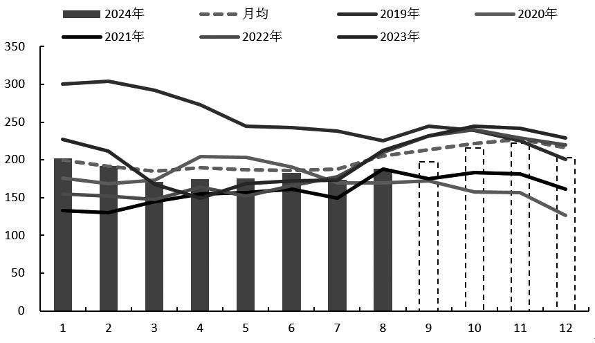 图为马来西亚棕榈油月度库存(万吨) 预计9月马来西亚棕榈油产量环比略增,但印尼出口关税上调后,马来西亚出口降幅可能收敛。根据最新的船运商检机构数据,9月前15日马来西亚棕榈油出口增速已从负转正,9月底或继续累库至190万吨。从远期看,由于季节性增产,后续马来西亚棕榈油将继续累库,但是库存水平略低于平均水平,也低于去年同期。 无论是环比还是同比,6月印尼棕榈油产量均呈下降趋势,1至6月累计产量同比减少4.05%,降幅扩大。6月印尼出口总关税下降,出口量大增至338.5万吨,1至6月累计出口同比减少7.7%。由于生物柴油产量保持较高增速,6月印尼棕榈油内需消费回升至200万吨附近,1至6月累计同比增长5.94%。6月底印尼棕榈油库存下降至281万吨,相比马来西亚,印尼的库存压力更小,这也是今年以来马来西亚和印度的精炼棕榈油价差始终处于历史同期偏低水平的原因。 一些机构先是预估2024年全年产量和去年持平,再逐步下调,比去年减产30万至50万吨。相比于马来西亚,去年厄尔尼诺对印尼的影响更大,这些更多体现在印尼上半年的产量上。今年年初印尼部分地区雨水偏少,但是相比去年同期降雨仍偏多,因此下半年印尼产量情况可能比去年下半年好一些,但是在内需旺盛的背景下,最终库存将低于历史均值水平,也会低于去年同期水平。 印度上调食用油进口关税的持续性。近日印度将棕榈油及其他食用油的进口关税上调20%,市场人士认为印度此举旨在扶持其国内油籽种植户。根据印度政府上周五发布的通知,关税上调自上周六开始生效,毛棕榈油、毛豆油和毛葵花籽油的基础关税从零上调至20%,精炼食用油的基础关税则从12.5%上调至32.5%。再加上农业基础设施与发展税和社会福利附加税,印度粗炼食用油的进口税将从5.5%提高到27.5%,精制食用油的进口税则从13.75%提高到35.75%。