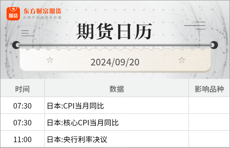 隔夜行情![]() ![]() 每日精选国家发改委最新发声!多渠道增加居民收入、适时推出一批增量政策举措 人民币大涨 发生了什么? 宽松周期将如何影响大宗商品? 宏观产经央视网:国务院召开实施渐进式延迟法定退休年龄工作动员部署视频会议,中共中央政治局常委、国务院总理李强在会上强调,稳妥有序实施渐进式延迟法定退休年龄改革,为推进中国式现代化提供重要支撑。 国家发改委:国家发改委发言人在新闻发布会上表示,加强政策预研储备,适时推出一批操作性强、效果好、让群众和企业可感可及的增量政策举措。深入实施就业优先政策,多渠道增加居民收入,不断提高居民消费能力。 证券时报:十部门印发关于加快提升新能源汽车动力锂电池运输服务和安全保障能力的若干措施,力争到2027年,动力锂电池运输的堵点卡点进一步打通,运输效率稳步提升,综合运输结构进一步优化,运输安全保障水平大幅提升,保障新能源汽车及动力锂电池产业链供应链安全稳定,为更好服务外贸“新三样”,全力支撑经济高质量发展,加快构建新发展格局提供有力支撑。 品种资讯黑色系期货 螺纹钢:据我的钢铁网(Mysteel),截至9月19日当周,全国螺纹钢产量连续第四周增加,厂库由降转增,社库连续第十一周减少,表需由增转降。(新华财经) 本周唐山主要仓库及港口同口径钢坯库存133.72万吨,周环比减少6.71万吨。较去年同期增56.65%,调研周期内,下游调坯企业补库增多,社库去库明显;港口方面,内贸资源集港出口量仍存。(我的钢铁网) 煤炭:国家能源局9月19日在北京组织召开煤矿智能化建设和煤炭清洁高效利用工作推进会。会议要求,各产煤省区、煤炭企业要立足以煤为主的基本国情,全力抓好煤炭高质量发展各项工作,为加快构建新型能源体系、保障国家能源安全“压好舱”“兜好底”。(财联社) 铁矿石:新口径114家钢厂进口烧结粉总库存2604.3万吨,环比上期降5.46万吨。进口烧结粉总日耗115.04万吨,增1.33万吨。库存消费比22.64,降0.31。原口径64家钢厂进口烧结粉总库存1085.44万吨,降4.59万吨。进口烧结粉总日耗59.82万吨,增1.17万吨。(我的钢铁网) 农产品期货 棕榈油:印尼财政部发布新的棕榈油征税规则,粗棕榈油的征税率定为7.5%(而非6%),该税率是基于政府的参考价格。(财联社) 大豆:USDA最新干旱报告显示,截至9月17日当周,约33%的美国大豆种植区域受到干旱影响,而此前一周为26%,去年同期为53%。约26%的美国玉米种植区域受到干旱影响,而此前一周为18%,去年同期为58%。约34%的美国棉花种植区域受到干旱影响,而此前一周为41%,去年同期为41%。 美国农业部出口销售周报显示,截至9月12日当周,美国2024/2025年度大豆出口净销售为174.8万吨,前一周为147.4万吨。(新华财经) 玉米:国际谷物理事会(IGC)将2024/25年度全球玉米产量预期下调200万吨,降至12.24亿吨;将2024/25年度全球小麦产量预测下调100万吨,至7.98亿吨。 美国农业部出口销售周报显示,截至9月12日当周,美国2024/2025年度玉米出口净销售为84.7万吨,前一周为66.6万吨。(新华财经) 有色/贵金属期货 沪铜:9月19日上海、广东两地保税区铜现货库存累计5.48万吨,较9日降0.42万吨,较12日降0.35万吨; 上海保税区5.20万吨,较9日降0.40万吨,较12日降0.35万吨; 广东保税区0.28万吨,较9日降0.02万吨,较12日持平;保税区库存继续表现去库,进口窗口维持打开,近期虽有到船货源抵港,但部分仓库仍有出库清关进口国内,库存因此表现下降。(我的钢铁网) 沪锌:截至9月19日周四,七地锌锭库存总量为11.45万吨,较9月9日减少0.31万吨,较9月12日增加0.11万吨,国内库存录增。(SMM) 碳酸锂:上海钢联发布数据显示,9月19日电池级碳酸锂价格较上日下跌500元,均价报7.55万元/吨。(财联社) 能化期货 PVC:截至9月19日,国内PVC社会库存环比下降1.26%在49.2万吨,同比增加15.11%;其中华东地区环比下降1.18%在45.17万吨,同比增加21.88%,华南地区环比下降2.18%在4.03万吨,同比下降29.05%。短期PVC社会仓库库存量持续高位,市场去库缓慢,市场现货价格持续承压。(隆众资讯) 瓶片:周内瓶片开工率下滑,供应偏紧,部分货源紧张,对市场存较强支撑。虽然现货跌幅略高于上游,但实际利润变化有限。依据隆众资讯生产成本计算模型,聚酯瓶片行业利润平均在-103.86元/吨,较上周减少15.82元/吨或-17.97%。(隆众资讯) 燃油:据新加坡企业发展局(ESG),截至9月18日当周,新加坡燃料油库存上涨169万桶,达到1854.5万桶的两周高点。(新华财经) 环球视野财联社:美国上周首次申领失业救济人数为21.9万人,预估为23万人,前值为23万人。 央视新闻:当地时间9月19日,英国中央银行英格兰银行宣布,将基准利率维持在5%。8月1日,英格兰银行将基准利率从5.25%下调至5%。此前,由于英国通胀高企,英格兰银行曾多次提高利率,控制物价水平。 每日关注![]() (文章来源:东方财富研究中心) (责任编辑:迷你学人) |