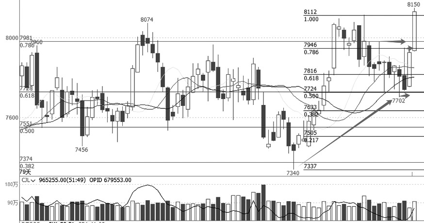 从棕榈油加权日线走势图可以看出,该品种于8月中旬见底回升、强劲反弹,上破前高8074元/吨后,冲高回落。在震荡回落的走势中,价格波动很大,但是走势幅度有限,同时随着价格的回落持仓大幅缩减,这都说明走低只是一个回调。近期价格在均线附近及反弹幅度一半的位置宽幅震荡,指标具备了看涨反转的条件。昨日更是高开高走强劲走高,不仅上破一系列的上影线,使其成为多方尖兵线,还上破了前期高点,回归了上涨态势,后市有望冲击阶段性前期高点8302元/吨一线。 PVC 弱势探底