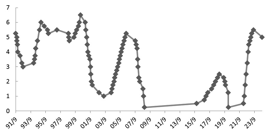 图为美国联邦基金目标利率走势(单位:%) 当前各期限国债收益率处于历史低位,部分品种定价已经隐含了央行下调政策利率的影响,但考虑到央行“以我为主”,货币政策保持稳健,短期降息预期落空,且央行多次提示长期债券收益率风险,预计国债利率下行空间有限,加上国庆长假前市场情绪将逐步趋于谨慎,谨防高位回落。(作者单位:申银万国期货) (责任编辑:迷你学人) |