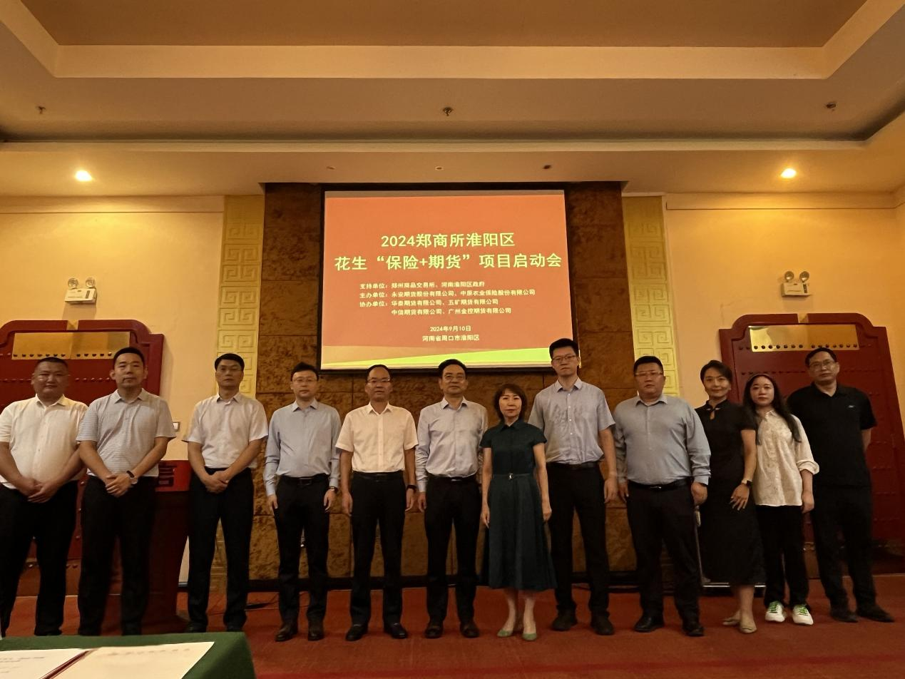 期货日报网讯(资深记者 崔蕾)9月10日,由郑州商品交易所、河南淮阳区政府支持,永安期货股份有限公司和中原农险河南分公司主办的“2024郑商所河南淮阳区花生“保险+期货”试点项目启动会在河南周口淮阳区举行,淮阳区相关政府部门、郑州商品交易所、保险公司、期货公司及农户代表共计约50人参加启动仪式活动。 该项目在郑州商品交易所、河南淮阳区政府的大力支持和指导下,由永安期货股份有限公司牵头,联合中原农险、五矿期货、华泰期货、中信期货、广州金控期货共同开展,项目总保费规模约1147万元,其中郑州商品交易所支持约400万元,河南省财政与淮阳区财政资金支持约400余万,永安、五矿、华泰、中信、广金五家承做项目的期货公司支持约230余万,通过“保险+期货”模式,预计为淮阳区冯塘乡、大连乡、葛店乡、刘振屯镇、朱集乡约18200户农户的15万亩花生种植户规带来风险保障,助力当地花生产业发展和农户的稳产增收。 启动仪式上,淮阳区政府副书记王春华发表致辞并指出,淮阳是农业大县,也是全国花生种植重点县(区),淮阳花生被评为“全国名特优新农产品”,种植面积常年保持在35万亩左右,花生产量稳定在8.5万吨上下,花生产业一直是淮阳优质产业发展项目,不仅促进农民增收致富,又极大的促进了地方产业经济发展,成为了乡村振兴产业链中重要的一环,为积极探索通过价格保险为花生种植群众提供价格风险保障,奋力开创淮阳保险金融高质量发展新局面,淮阳区委书记也高度关注和支持此次项目试点,淮阳将充分利用好难得的试点契机,加强领导,周密部署,大力支持,确保把这项利民工程做实做细做扎实,做出成效与亮点,让群众获得可靠的花生价格保障,得到更大的实惠。