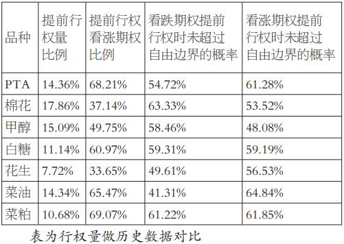 提前行权情况解析 历史数据显示,实际交易中的提前行权与理论存在一定差异,并非超出自由边界时才会行权,这意味着投资者在持有期权的价格大于行权收益时发出行权指令。为什么会有这样的行为呢?本文选取上市时间较长的白糖、棉花、PTA和甲醇期权来分析。 标的行情和波动率对行权有一定影响 在隐含波动率较高时或升高后一段时间内,对应行情通常为有较大幅度的涨跌时或之后,提前行权概率增加。但这并不是一个强相关关系,以棉花期权为例,推测在出现明显趋势时,权利方更倾向于行权以扩大|Delta|敞口,有机会获得更高收益额。 提前行权合约多为深度实值合约 白糖、棉花、PTA和甲醇提前行权合约加权平均|Delta|为0.98、0.96、0.91和0.91。深度实值期权与期货在短期的风险收益非常接近,同时深度实值合约的流动性通常远小于标的期货,因此权利方可能考虑流动性而选择先行权,再平仓期货,以此降低交易的摩擦成本。加权平均以行权量为权重计算加权平均值。 期权的时间价值并非行权的考虑要点 期权的时间价值受剩余到期时间影响,虽然|Delta|>0.9的实值合约通常时间价值较少,但依然有剩余到期时间越长时间价值越高的规律。白糖、棉花、PTA和甲醇提前行权时间距离到期日的加权平均天数为22、17、13和1天,仅甲醇期权的提前行权时间较接近到期日,时间价值较少,其余品种行权时的剩余到期时间较长,权利方在行权时放弃了期权时间价值。结合前两条分析,部分投资者在使用期权工具时更注重的是标的行情和市场流动性等方面,而对期权本身特性的考虑相对较少。