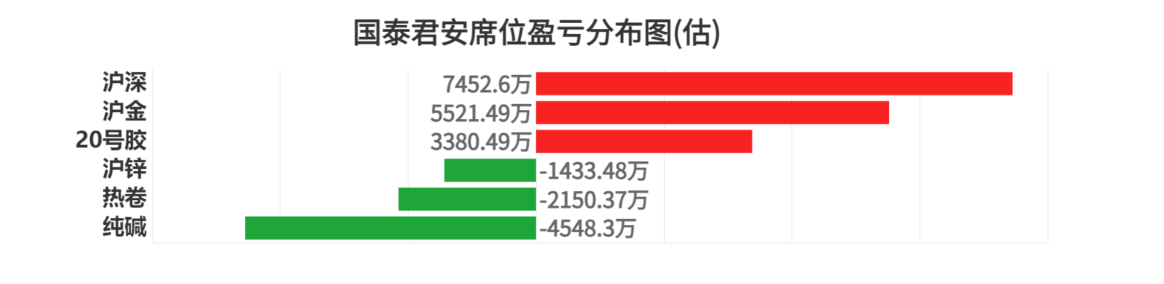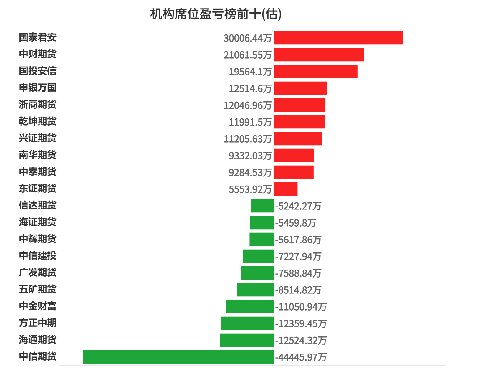 每日期货龙虎榜,带你深度了解市场。 市场一览:周一商品期货综合指数上涨0.15%,日内资金净流出6.49亿元。 市场成交量为3157.04万手,成交额为1.94万亿元。 持仓量为3279.41万手,较前一交易日增加1.44万手。 市场成交量前十和持仓量前十如下图所示: ![]() ![]() ![]() 品种盈亏榜:今日商品期货上榜机构席位中沪金盈利第一,为61723.67万元。 玻璃亏损第一,为7647.60万元。 ![]() 就沪金而言,今日盈利前三席位为中财期货、东证期货、海通期货,分别盈利22576.62万元、11671.08万元、9886.77万元。 今日亏损前三席位为齐盛期货、金瑞期货、方正中期,分别亏损5022.40万元、2695.97万元、2487.71万元。 ![]() 就玻璃而言,今日盈利前三席位为申银万国、广发期货、徽商期货,分别盈利4894.97万元、1651.49万元、1163.46万元。 今日亏损前三席位为中金财富、方正中期、国盛期货,分别亏损7651.80万元、2853.72万元、2832.49万元。 ![]() 席位盈亏榜:今日机构席位中国泰君安盈利第一,为30006.44万元。 中信期货亏损第一,为44445.97万元。 ![]() 就国泰君安席位而言,今日盈利前三品种为沪深、沪金、20号胶,分别盈利7452.60万元、5521.49万元、3380.49万元。 今日亏损前三品种为纯碱、热卷、沪锌,分别亏损4548.30万元、2150.37万元、1433.48万元。 ![]() 就中信期货席位而言,今日盈利前三品种为沪金、甲醇、橡胶,分别盈利7650.24万元、2194.55万元、1942.91万元。 今日亏损前三品种为沪深、中证1000股指、螺纹钢,分别亏损19851.08万元、19572.04万元、5393.75万元。 ![]() (文章来源:东方财富研究中心) (责任编辑:迷你学人) |