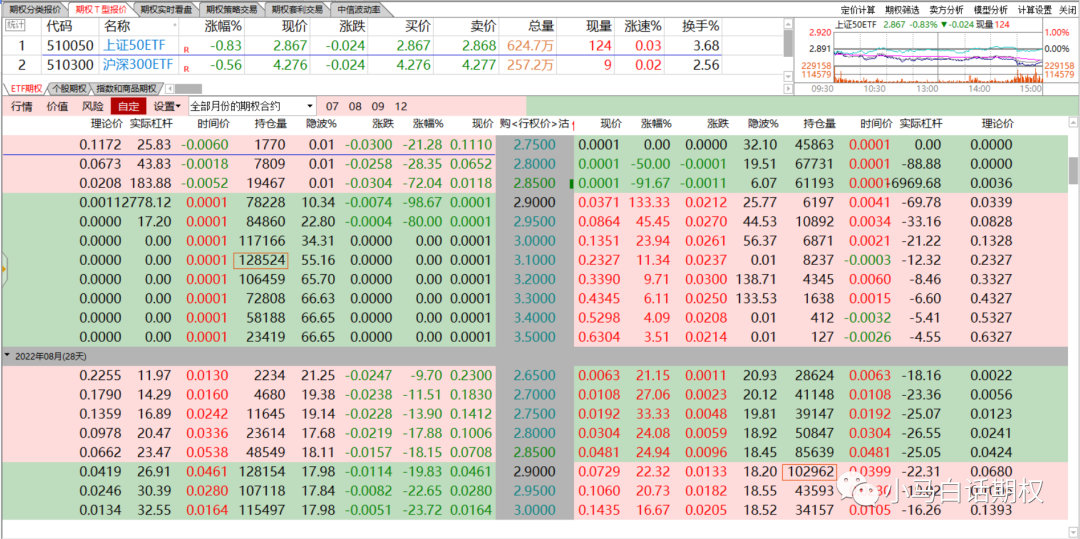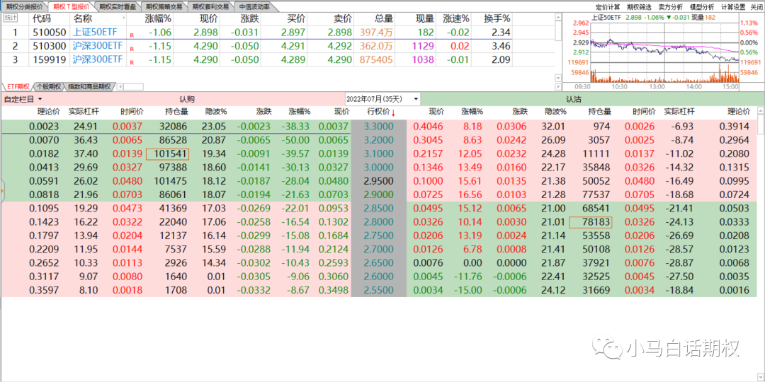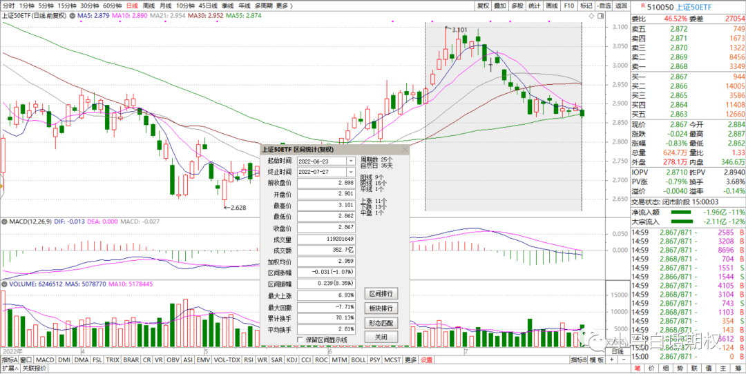 上月期权合约行权日50ETF收盘2.898元(6月22日),本月(7月27日)收盘2.867元,最高3.101元(6月28日),最低2.864元(7月18日),区间跌幅1.07%,主要成分股先继续反弹再震荡回落的走势比较多。