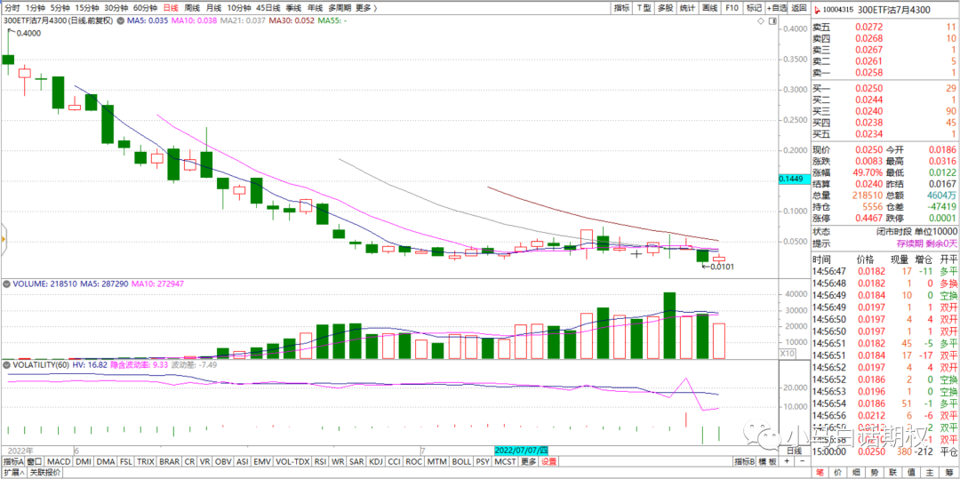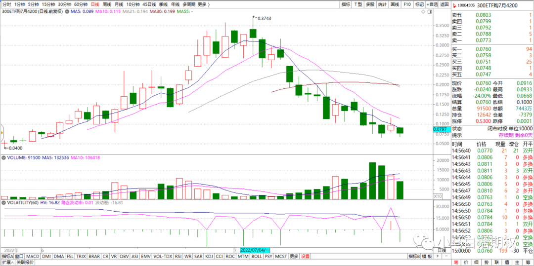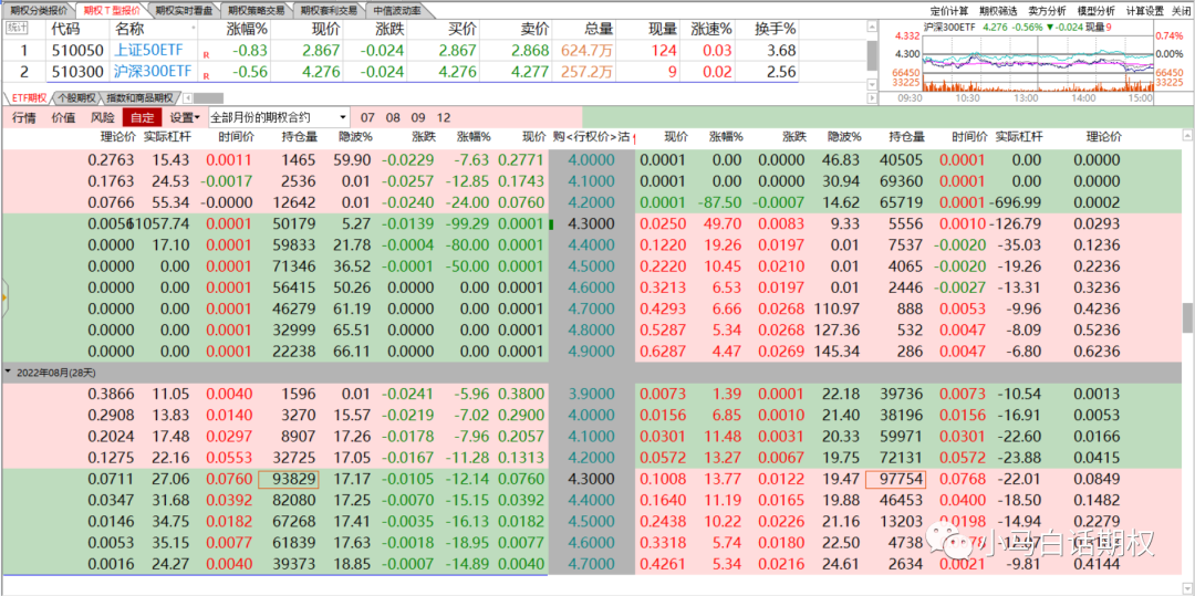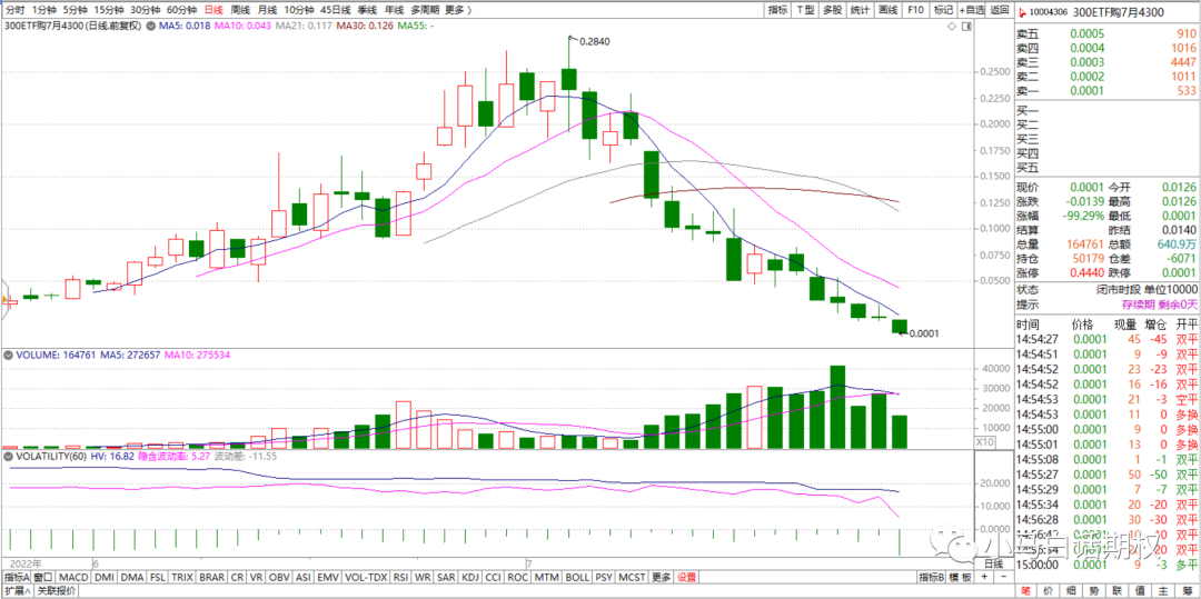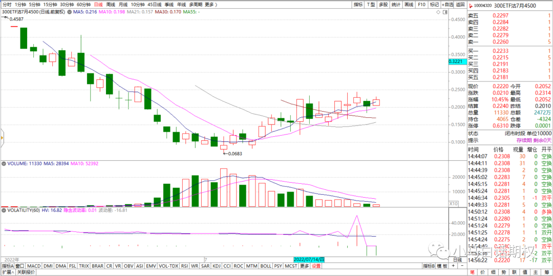 上月期权合约行权日300ETF收盘4.29元(6月22日),本月(7月27日)收盘4.276元,最高4.565元(7月5日),最低3.932元(7月25日),区间跌幅0.33%,主要成分股分化,也是冲高回落的股票比较多。