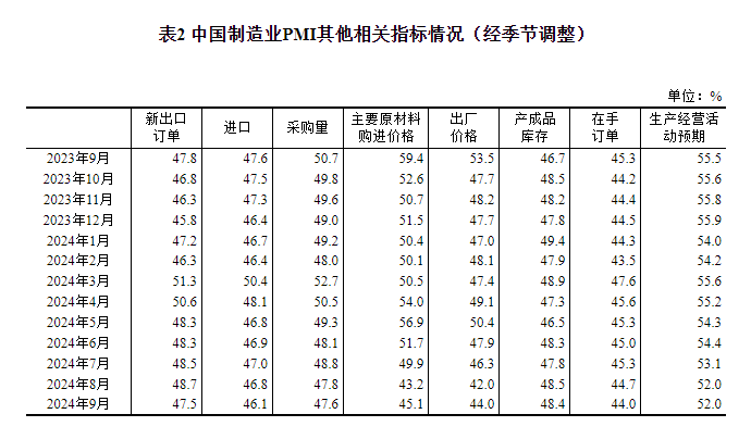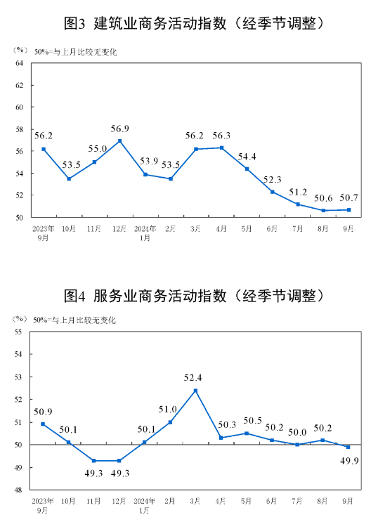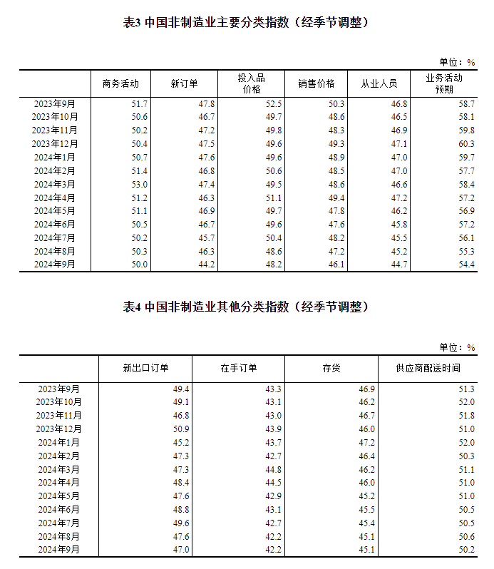 一、中国制造业采购经理指数运行情况 9月份,制造业采购经理指数(PMI)为49.8%,比上月上升0.7个百分点,制造业景气度回升。 ![]() 从企业规模看,大、中、小型企业PMI分别为50.6%、49.2%和48.5%,比上月上升0.2、0.5和2.1个百分点。 从分类指数看,在构成制造业PMI的5个分类指数中,生产指数高于临界点,新订单指数、原材料库存指数、从业人员指数和供应商配送时间指数均低于临界点。 生产指数为51.2%,比上月上升1.4个百分点,升至临界点以上,表明制造业企业生产活动有所加快。 新订单指数为49.9%,比上月上升1.0个百分点,表明制造业市场需求景气度有所改善。 原材料库存指数为47.7%,比上月上升0.1个百分点,表明制造业主要原材料库存量降幅略有收窄。 从业人员指数为48.2%,比上月上升0.1个百分点,表明制造业企业用工景气度略有回升。 供应商配送时间指数为49.5%,比上月下降0.1个百分点,表明制造业原材料供应商交货时间继续延长。 ![]() ![]() 二、中国非制造业采购经理指数运行情况 9月份,非制造业商务活动指数为50.0%,比上月下降0.3个百分点,非制造业景气水平小幅回落。 ![]() 分行业看,建筑业商务活动指数为50.7%,比上月上升0.1个百分点;服务业商务活动指数为49.9%,比上月下降0.3个百分点。从行业看,邮政、电信广播电视及卫星传输服务、互联网软件及信息技术服务、货币金融服务等行业商务活动指数均位于55.0%以上较高景气区间;铁路运输、水上运输、房地产、文化体育娱乐等行业商务活动指数低于临界点。 ![]() 新订单指数为44.2%,比上月下降2.1个百分点,表明非制造业市场需求景气水平有所回落。分行业看,建筑业新订单指数为39.5%,比上月下降4.0个百分点;服务业新订单指数为45.0%,比上月下降1.8个百分点。 投入品价格指数为48.2%,比上月下降0.4个百分点,表明非制造业企业用于经营活动的投入品价格总体水平继续回落。分行业看,建筑业投入品价格指数为50.0%,比上月上升2.4个百分点;服务业投入品价格指数为47.9%,比上月下降0.9个百分点。 销售价格指数为46.1%,比上月下降1.1个百分点,表明非制造业销售价格总体水平较上月回落。分行业看,建筑业销售价格指数为48.0%,比上月下降0.1个百分点;服务业销售价格指数为45.7%,比上月下降1.4个百分点。 从业人员指数为44.7%,比上月下降0.5个百分点,表明非制造业企业用工景气度继续下降。分行业看,建筑业从业人员指数为40.0%,比上月下降1.0个百分点;服务业从业人员指数为45.5%,比上月下降0.4个百分点。 业务活动预期指数为54.4%,比上月下降0.9个百分点,高于临界点,表明多数非制造业企业对市场发展保持信心。分行业看,建筑业业务活动预期指数为53.1%,比上月下降1.6个百分点;服务业业务活动预期指数为54.6%,比上月下降0.8个百分点。 ![]() 三、中国综合PMI产出指数运行情况 9月份,综合PMI产出指数为50.4%,比上月上升0.3个百分点,表明我国企业生产经营活动总体扩张有所加快。 ![]() 附注 1、主要指标解释 采购经理指数(PMI),是通过对企业采购经理的月度调查结果统计汇总、编制而成的指数,它涵盖了企业采购、生产、流通等各个环节,包括制造业和非制造业领域,是国际上通用的监测宏观经济走势的先行性指数之一,具有较强的预测、预警作用。综合PMI产出指数是PMI指标体系中反映当期全行业(制造业和非制造业)产出变化情况的综合指数。PMI高于50%时,反映经济总体较上月扩张;低于50%,则反映经济总体较上月收缩。 2、调查范围 涉及《国民经济行业分类》(GB/T4754-2017)中制造业的31个行业大类,3200家调查样本;非制造业的43个行业大类,4300家调查样本。 3、调查方法 采购经理调查采用PPS(Probability Proportional to Size)抽样方法,以制造业或非制造业行业大类为层,行业样本量按其增加值占全部制造业或非制造业增加值的比重分配,层内样本使用与企业主营业务收入成比例的概率抽取。 本调查由国家统计局直属调查队具体组织实施,利用国家统计联网直报系统对企业采购经理进行月度问卷调查。 4、计算方法 (1)分类指数的计算方法。制造业采购经理调查指标体系包括生产、新订单、新出口订单、在手订单、产成品库存、采购量、进口、主要原材料购进价格、出厂价格、原材料库存、从业人员、供应商配送时间、生产经营活动预期等13个分类指数。非制造业采购经理调查指标体系包括商务活动、新订单、新出口订单、在手订单、存货、投入品价格、销售价格、从业人员、供应商配送时间、业务活动预期等10个分类指数。分类指数采用扩散指数计算方法,即正向回答的企业个数百分比加上回答不变的百分比的一半。由于非制造业没有合成指数,国际上通常用商务活动指数反映非制造业经济发展的总体变化情况。 (2)制造业PMI指数的计算方法。制造业PMI是由5个扩散指数(分类指数)加权计算而成。5个分类指数及其权数是依据其对经济的先行影响程度确定的。具体包括:新订单指数,权数为30%;生产指数,权数为25%;从业人员指数,权数为20%;供应商配送时间指数,权数为15%;原材料库存指数,权数为10%。其中,供应商配送时间指数为逆指数,在合成制造业PMI指数时进行反向运算。 (3)综合PMI产出指数的计算方法。综合PMI产出指数由制造业生产指数与非制造业商务活动指数加权求和而成,权数分别为制造业和非制造业占GDP的比重。 5、季节调整 采