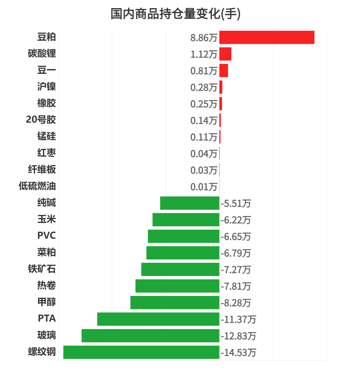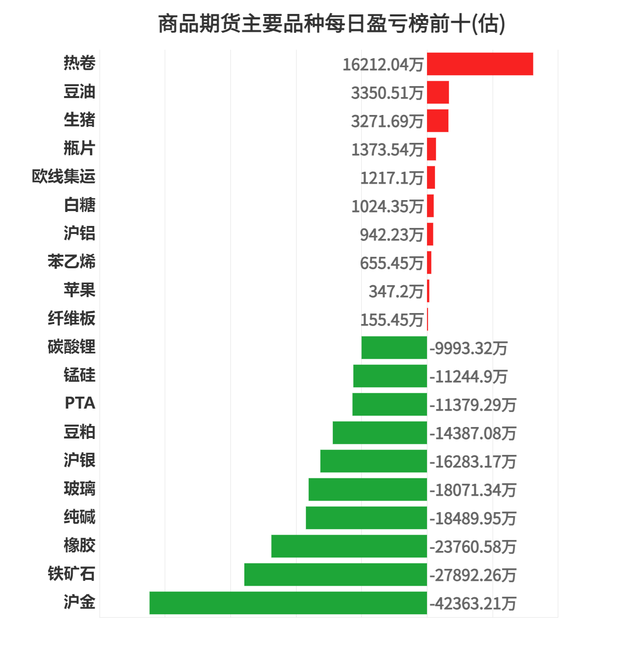 每日期货龙虎榜,带你深度了解市场。 市场一览:周一商品期货综合指数上涨1.7%,日内资金净流出76.97亿元。 市场成交量为3783.37万手,成交额为2.35万亿元。 持仓量为2798.33万手,较前一交易日减少136.95万手。 市场成交量前十和持仓量前十如下图所示: ![]() ![]() ![]() 品种盈亏榜:今日商品期货上榜机构席位中热卷盈利第一,为16212.04万元。 沪金亏损第一,为42363.21万元。 ![]() 盈亏数据为对应龙虎榜持仓的估算数据 注:可通过点击东方财富期货APP资讯页面“龙虎榜”及东方财富期货PC端左侧“龙虎榜”查看各类机构持仓及盈亏榜单信息。点此查看>>