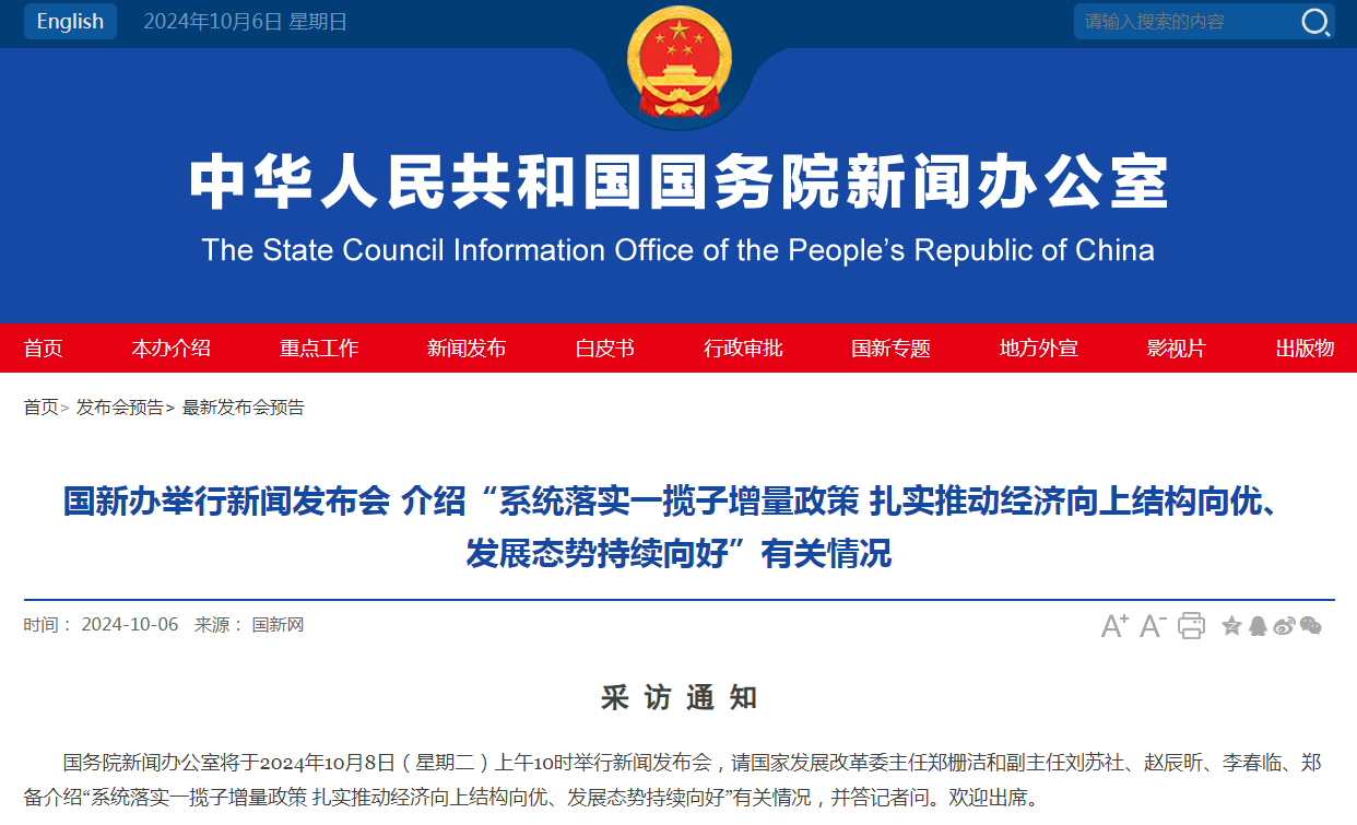 国新办将举行新闻发布会 介绍系统落实一揽子增量政策有关情况 界面新闻 10月06日 10月6日,国务院新闻办公室发布采访通知:国务院新闻办公室将于2024年10月8日(星期二)上午10时举行新闻发布会,请国家发展改革委主任郑栅洁和副主任刘苏社、赵辰昕、李春临、郑备介绍“系统落实一揽子增量政策 扎实推动经济向上结构向优、发展态势持续向好”有关情况,并答记者问。(文章来源:界面新闻) (责任编辑:迷你学人)