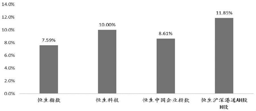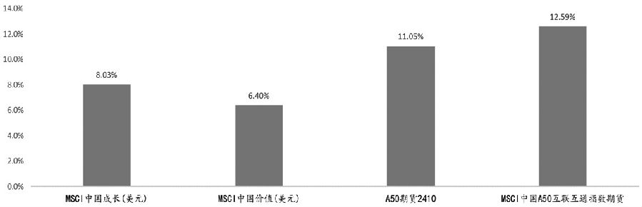 图为10月2—4日港股主要指数涨幅 行业方面,以恒生综合行业指数的分类来看,咨询科技业领涨(累计上涨9.05%),非必需性消费(累计上涨8.55%)、能源业(累计上涨8.15%)、医疗保健业(累计上涨8.04%)、地产建筑业(累计上涨7.89%)涨幅相对较大。公用事业(累计上涨2.56%)、电讯业(累计上涨3.25%)、综合企业(累计上涨3.82%)、必需性消费(累计上涨4.04%)、原材料业(累计上涨4.65%)和工业(累计上涨4.91%)涨幅相对较小。 从其他中国权益资产相关标的来看,长假期间(10月2—4日)同样较为强势。MSCI中国成长(美元)累计上涨8.03%, MSCI中国价值(美元)累计上涨6.40%,A50期货累计上涨11.05%,MSCI中国A50互联互通指数期货累计上涨12.59%。 从包含A股的H股涨跌幅来看,券商股涨幅居前,此外,弘业期货、万科企业、上海复旦、复旦张江涨幅相对较大,仅5只个股下跌,其中南方航空和中远海控跌幅相对较大。 股指期货升水并未充分计价节假日期间港股所映射的涨幅。受市场多头气氛火爆影响,股指期货各品种合约的升水都已处于历史极高水平,在此情况下,投资者可以考虑各类“吃升水”策略的应用,尤其是在IF和IH合约上。