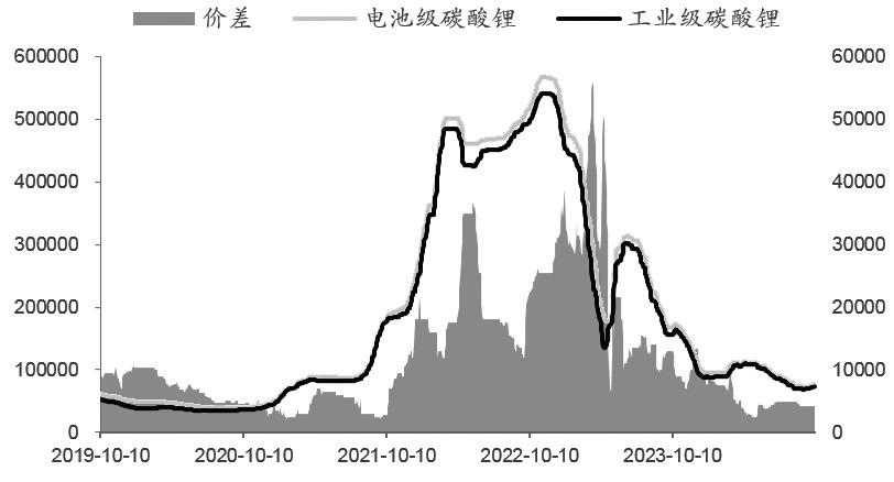 广州期货交易所碳酸锂期货基准交割品为电池级碳酸锂(简称电碳),替代交割品为工业级碳酸锂(简称工碳),贴水25000元/吨。电碳纯度要求99.5%以上,对钠、镁、钾、钙等杂质设定较为严格的标准,并对磁性物质和粒径做出规范;工碳标准相对宽松,纯度要求99.2%以上,对特定元素的含量要求相对较低,并且对磁性物质、粒径等不做要求。从升贴水设置来看,25000元/吨的贴水设置表明交易所鼓励以电碳为主导的交割,目前各交割库仓单均为电碳。 电碳由于标准高,制作出的电池性能更高更稳定,主要用于动力电池领域,工碳部分用于制造玻璃、陶瓷等工业品,部分用于性能要求偏低的储能电池。随着技术的革新,部分头部正极厂也能使用工碳生产满足动力电池标准的正极材料。 目前国内碳酸锂生产分为锂辉石、锂云母、提锂,盐湖提锂,回收提锂,矿石来源以电碳为主,盐湖来源由于卤水杂质较多,以工碳为主,回收来源根据各家回收技术的不同,电碳、工碳兼具。国内电碳目前月产占比60%~70%,从2023年之后的趋势看,以矿山为主的锂资源投产带动电碳占比逐渐提升;盐湖锂资源投产节奏较慢,从2024年开始爬坡,今年工碳占比有略微回升趋势。 长周期中电碳与工碳价差和碳酸锂价格走势较为一致,历史趋势来看,随着碳酸锂价格上涨,电炭与工碳价差也随之扩大。近5年中,电碳与工碳价差在2021年1月达到谷值2000元/吨,对应电碳价格69000元/吨;在2023年3月达到峰值56000元/吨,对应电碳价格约301500元/吨。虽然电碳与工碳价差谷峰值与电碳价格谷峰值并不完全匹配,但也接近短期内的极值,说明电碳与工碳价差对行情研判具有一定的参考意义。 碳酸锂期货上市以来,期现套利的运用使得现货与期货表现出越来越强的相关性。从碳酸锂主力合约价格和电碳与工碳价差走势来看,短期行情中两者表现出明显的负相关性:碳酸锂期货价格走弱往往伴随着电碳与工碳价差扩大,短期反弹也伴随着电碳与工碳价差收窄。 锂产业链中,部分企业对工碳的需求较为刚性,如电解液厂家生产环节中使用超纯碳酸锂,提纯过程中使用价格偏低的工碳更具性价比;又如储能电池和低端动力电池,对性能要求不那么高,工碳也能满足生产。对此类厂家,只要电碳、工碳存在价差,刚性需求便一直存在。目前国内生产格局以电碳为主,从基本面的角度理解,当基本面改善,现货需求增加,工碳理应率先感知变化,工碳价格较电碳上涨幅度更大,表现为电碳与工碳价差收窄;当基本面宽松,盐湖工碳成本更低,降价空间更大,表现为电碳与工碳价差扩大。短期而言,从电碳与工碳价差的变化能推演出现货市场的敏感变化。