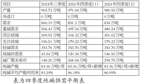 2.产量预估 纯碱企业通常在四季度较少检修。在不核算新产能的前提下,产能利用率分两种情况进行估算—— 情况一:假设今年四季度产能利用率情况与去年四季度相似,平均产能利用率为86.18%。根据三季度末纯碱产量与产能利用率推算,纯碱周产能已经高达83.36万吨,以此推算四季度纯碱产量约944.18万吨。 情况二:假设四季度产能利用率情况与2024年1—8月相似,平均产能利用率为86.99%,则四季度纯碱产量约953.05万吨。 新产能估算:按目前的产能投放计划,330万吨新增产能有超过一半将在10月达产。按保守估算,假设有一半产能从11月开始达产,四季度将贡献新增产量27.5万吨。 综上,四季度纯碱产量估算约971.68万~980.55万吨。 3.需求预估 浮法玻璃:三季度末浮法玻璃日熔量16.36万吨。截至2024年9月27日,浮法玻璃厂内库存高达7287.9万重箱,已经超过2022年,处于历史同期最高位。在生产亏损、需求萎缩、库存高企的情况下,浮法玻璃企业仍有冷修预期。按照过往经验,浮法玻璃日熔量需下降至15.5万吨附近,才能实现产销平衡。但当前有宏观及地产政策刺激,对玻璃的需求拉动仍有待观察,故分两种情况估算浮法玻璃日熔量—— 情况一:假设宏观及地产政策利多拉动需求,浮法玻璃日熔量停止下降,并逐步上升到一季度的峰值17.65万吨,并与一季度类似,平均值维持在17.30万吨之上,则四季度浮法玻璃产量估算为1591.60万吨,对纯碱需求318.32万吨。 情况二:假设宏观及地产政策利好作用有限,浮法玻璃日熔量没有上升,但也无须下降即可达到产销平衡,估算四季度浮法玻璃日熔量维持16.36万吨,总产量1505.12万吨,对纯碱需求301.02万吨。 光伏玻璃:三季度末光伏玻璃日熔量9.74万吨。光伏玻璃产能过剩问题同样严峻,库存持续积累,截至2024年9月27日,光伏玻璃样本企业库存可用天数38.69天,较二季度末增加11.86天,呈现持续快速增长态势。光伏玻璃企业深陷亏损境地,冷修幅度较浮法玻璃更大,近期有消息称十大光伏玻璃生产厂商计划减产30%。假设按最乐观预期,四季度光伏玻璃日熔量不再下降,维持9.74万吨,则四季度预估将消耗纯碱179.22万吨。 轻碱需求:轻碱下游需求较为分散,但也相对较为稳定,暂按三季度轻碱消费量进行估算,四季度轻碱需求约353.76万吨。 综上,四季度纯碱需求估算834万~851.3万吨。 4.进出口预估 纯碱1—8月合计进口89.19万吨,出口累计58.88万吨,净进口30.31万吨,平均净进口3.79万吨/月。随着国内纯碱价格下跌、进口利润基本消失,从5月开始纯碱进出口基本达到均衡,四季度预估将维持现状。暂按均衡状态估算,四季度纯碱净进口为零。 5.供需平衡表预估 根据以上供需展望,预估四季度纯碱供需平衡数据(如下表)。 (二)驱动因素 纯碱自2023年产能大投放(新增产能620万吨)开始,逐步走向供应过剩。2024年计划新增产能330万吨,因故全部推延至四季度落地,导致四季度过剩局面更加严峻。根据四季度供需推演,若产能利用率与去年四季度相似,平均产能利用率为86.18%,同时浮法玻璃日熔量在宏观的拉动下回升到一季度的高位,则供应过剩120.38万吨,四季度期末库存将上涨至268.58万吨;若产能利用率维持2024年的平均水平86.99%,同时浮法玻璃日熔量维持三季度末的水平也不再下降,则过剩146.55万吨,四季度期末库存将上涨至294.75万吨。