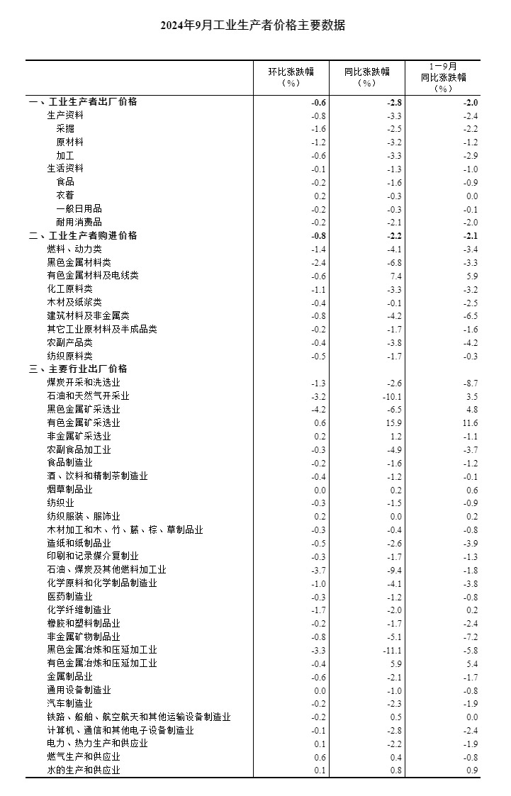 股市如棋局,开户先布局,随时把握投资机遇! 2024年9月份居民消费价格同比上涨0.4% 2024年9月份,全国居民消费价格同比上涨0.4%。其中,城市上涨0.4%,农村上涨0.6%;食品价格上涨3.3%,非食品价格下降0.2%;消费品价格上涨0.5%,服务价格上涨0.2%。1—9月平均,全国居民消费价格比上年同期上涨0.3%。 9月份,全国居民消费价格环比持平。其中,城市下降0.1%,农村上涨0.1%;食品价格上涨0.8%,非食品价格下降0.2%;消费品价格上涨0.2%,服务价格下降0.3%。 ![]() 一、各类商品及服务价格同比变动情况 9月份,食品烟酒类价格同比上涨2.3%,影响CPI(居民消费价格指数)上涨约0.66个百分点。食品中,鲜菜价格上涨22.9%,影响CPI上涨约0.48个百分点;鲜果价格上涨6.7%,影响CPI上涨约0.13个百分点;畜肉类价格上涨3.8%,影响CPI上涨约0.12个百分点,其中猪肉价格上涨16.2%,影响CPI上涨约0.21个百分点;水产品价格上涨2.0%,影响CPI上涨约0.04个百分点;蛋类价格下降4.1%,影响CPI下降约0.03个百分点;粮食价格下降0.7%,影响CPI下降约0.01个百分点。 其他七大类价格同比五涨两降。其中,其他用品及服务、衣着、医疗保健价格分别上涨3.5%、1.3%和1.2%,教育文化娱乐、生活用品及服务价格分别上涨0.6%和0.1%;交通通信、居住价格分别下降4.1%和0.1%。 ![]() 二、各类商品及服务价格环比变动情况 9月份,食品烟酒类价格环比上涨0.5%,影响CPI上涨约0.15个百分点。食品中,鲜菜价格上涨4.3%,影响CPI上涨约0.11个百分点;鲜果价格上涨2.1%,影响CPI上涨约0.04个百分点;蛋类价格上涨2.1%,影响CPI上涨约0.01个百分点;畜肉类价格上涨0.4%,影响CPI上涨约0.01个百分点,其中猪肉价格上涨0.4%,影响CPI上涨约0.01个百分点;水产品价格下降0.5%,影响CPI下降约0.01个百分点。 其他七大类价格环比一涨三平三降。其中,衣着价格上涨0.8%;生活用品及服务、医疗保健、其他用品及服务价格均持平;交通通信、教育文化娱乐、居住价格分别下降1.3%、0.3%和0.1%。 ![]() ![]() 附注 1.指标解释 居民消费价格指数(Consumer Price Index,简称CPI)是度量居民生活消费品和服务价格水平随着时间变动的相对数,综合反映居民购买的生活消费品和服务价格水平的变动情况。 2.统计范围 居民消费价格统计调查涵盖全国城乡居民生活消费的食品烟酒、衣着、居住、生活用品及服务、交通通信、教育文化娱乐、医疗保健、其他用品及服务等8大类、268个基本分类的商品与服务价格。 3.调查方法 采用抽样调查方法抽选确定调查网点,按照“定人、定点、定时”的原则,直接派人到调查网点或从互联网采集原始价格。数据来源于全国31个省(区、市)约500个市县、10万余家价格调查点,包括商场(店)、超市、农贸(生鲜)市场、服务网点和互联网电商等。 4.数据说明 由于“四舍五入”原因,有时会出现合计数据与分类数据高值或低值相同的情况。 2024年9月份工业生产者出厂价格同比降幅扩大 环比降幅收窄 2024年9月份,全国工业生产者出厂价格同比下降2.8%,环比下降0.6%;工业生产者购进价格同比下降2.2%,环比下降0.8%。1—9月平均,工业生产者出厂价格比上年同期下降2.0%,工业生产者购进价格下降2.1%。 ![]() ![]() 一、9月份工业生产者价格同比变动情况 工业生产者出厂价格中,生产资料价格下降3.3%,影响工业生产者出厂价格总水平下降约2.41个百分点。其中,采掘工业价格下降2.5%,原材料工业价格下降3.2%,加工工业价格下降3.3%。生活资料价格下降1.3%,影响工业生产者出厂价格总水平下降约0.35个百分点。其中,食品价格下降1.6%,衣着和一般日用品价格均下降0.3%,耐用消费品价格下降2.1%。 ![]() ![]() 工业生产者购进价格中,黑色金属材料类价格下降6.8%,建筑材料及非金属类价格下降4.2%,燃料动力类价格下降4.1%,农副产品类价格下降3.8%,化工原料类价格下降3.3%,纺织原料类价格下降1.7%;有色金属材料及电线类价格上涨7.4%。 二、9月份工业生产者价格环比变动情况 工业生产者出厂价格中,生产资料价格下降0.8%,影响工业生产者出厂价格总水平下降约0.61个百分点。其中,采掘工业价格下降1.6%,原材料工业价格下降1.2%,加工工业价格下降0.6%。生活资料价格下降0.1%,影响工业生产者出厂价格总水平下降约0.03个百分点。其中食品、一般日用品和耐用消费品价格均下降0.2%,衣着价格上涨0.2%。 工业生产者购进价格中,黑色金属材料类价格下降2.4%,燃料动力类价格下降1.4%,化工原料类价格下降1.1%,建筑材料及非金属类价格下降0.8%,有色金属材料及电线类价格下降0.6%,纺织原料类价格下降0.5%,农副产品类价格下降0.4%。 ![]() 附注 1.指标解释 工业生产者价格指数包括工业生产者出厂价格指数(Producer Price Index for Industrial Products, 简称PPI)和工业生产者购进价格指数。 工业生产者出厂价格指数反映工业企业产品第一次出售时的出厂价格的变化趋势和变动幅度。 工业生产者购进价格指数反映工业企业作为中间投入产品的购进价格的变化趋势和变动幅度。 2.统计范围 工业生产者出厂价格统计调查涵盖40个工业行业大类、1300多个基本分类的工业产品价格;工业生产者购进价格统计调查涵盖9大类、800多个基本分类的工业产品价格。 3.调查方法 工业生产者价格调查采取重点调查与典型调查相结合的调查方法,涉及全国4万多家工业企业。 4.统计标准 工业行业划分标准的依据是《国民经济行业分类》(GB/T4754-2017)。 5.数据说明 由于
