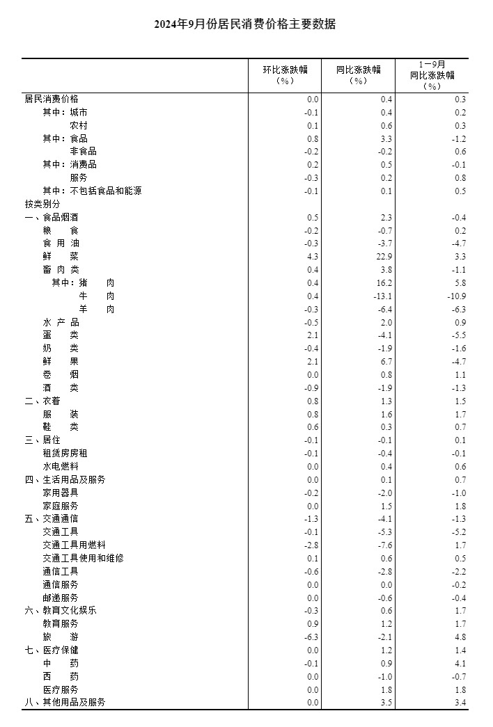 统计局:9月份CPI同比上涨0.4% PPI同比下降2.8%