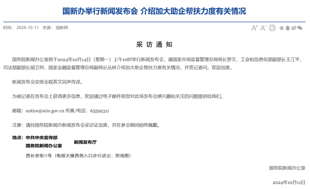 股市如棋局,开户先布局,随时把握投资机遇! 根据国务院新闻办公室发布的采访通知,10月14日,将举行两场新闻发布会。 ![]() 国新办举行新闻发布会介绍加大助企帮扶力度有关情况 国务院新闻办公室将于2024年10月14日(星期一)上午10时举行新闻发布会,请国家市场监督管理总局局长罗文、工业和信息化部副部长王江平、司法部副部长胡卫列、国家金融监督管理总局副局长丛林介绍加大助企帮扶力度有关情况,并答记者问。 ![]()