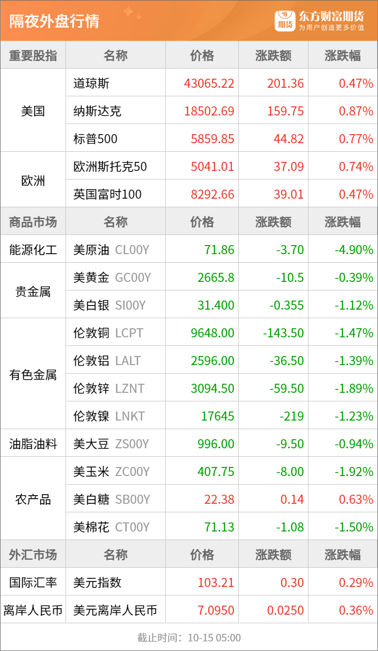 东方财富期货早餐 10月15日 周二