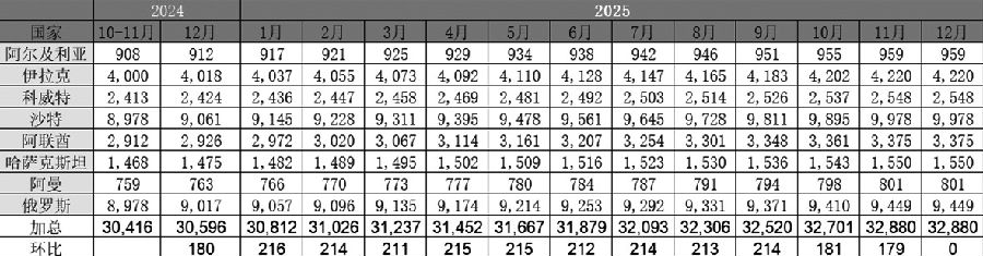 图为OPEC+成员国原油增产计划(单位:千桶/日) OPEC+方面,计划于12月开始逐月增产,每月增产约20万桶/日,持续到明年11月,完成220万桶/日的增产。也就是说,随着时间的推移,OPEC+增产会导致全球原油供应的持续增加,2025年原油市场供需平衡转向宽松。一种极端的情形是,若伊朗原油出口受损幅度较大导致油价短期大涨,OPEC超过400万桶/日的剩余产能使其能够通过增产来平抑油价。