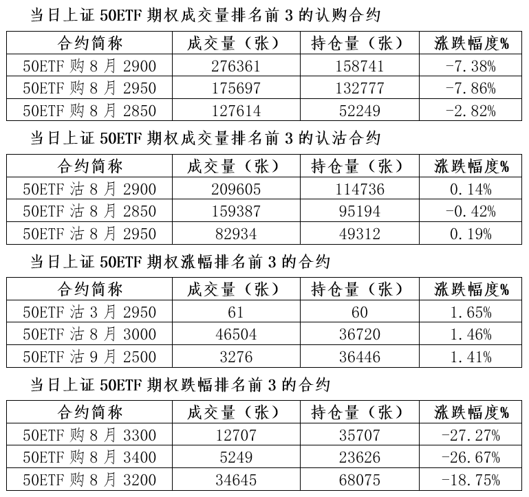 注:(1)涨跌幅度=(期权合约当日结算价-期权合约前结算价)/期权合约前结算价; (2)认沽认购比=认沽期权合约总成交量/认购期权合约总成交量; (3)当日结算价小于0.001元的合约及当日新挂合约不计入合约涨跌幅排名; (4)行权日,到期合约不计入当日成交量和涨跌幅排名。 免责声明: 以上信息仅反映期权市场交易运行情况,不构成对投资者的任何投资建议。投资者不应当以该等信息取代其独立判断或仅依据该等信息做出投资决策。对于投资者依据本信息进行投资所造成的一切损失,上海证券交易所不承担任何责任。 (责任编辑:期权号管家) |