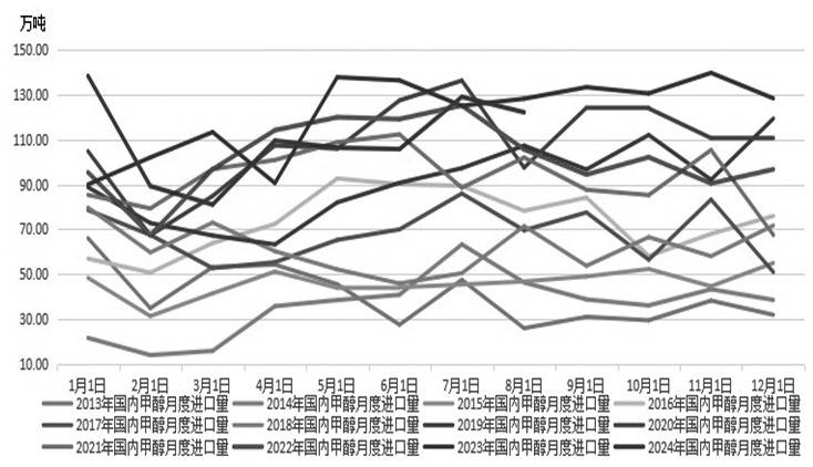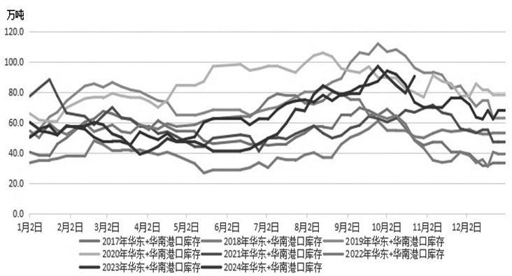 图为2013—2024年国内甲醇进口量走势(单位:万吨) 伊朗和以色列冲突升级,甲醇外运或受阻。伊朗甲醇是我国外部进口的主要来源国之一,伊朗波斯湾东北岸聚集着大量甲醇生产企业,一旦遭遇以色列袭击或面临停产以及外运受阻的风险,地缘事件升级或削弱外部甲醇进口预期。 目前海外甲醇供应压力有所缓和。据统计,2024年8月份我国甲醇进口量在122.14万吨。环比小幅回落5.33%,同比小幅减少4.72%。2024年1—8月中国甲醇累计进口量为881.42万吨,同比下跌4.54%。由于前期进口压力较大,导致国内港口甲醇库存处于高位。据统计,截至2024年10月11日当周,我国华东和华南地区的港口甲醇库存量维持在90.31万吨,周环比大幅上涨10.99万吨,月环比增加0.08万吨,较去年同期大幅增加17.12万吨。从过去几年库存走势来看,10月至11月末港口甲醇会迎来季节性库存去化阶段。据统计,2021—2023年,10月初至11月末,我国华东和华南甲醇港口库存去化幅度平均在38%左右。累库周期结束后,去库阶段的到来有望提振后市。 虽然目前国内处在 “金九银十”消费旺季,但甲醇下游需求依然偏弱。据统计,截至10月11日当周,国内甲醛开工率维持在30.47%,周环比略微回升0.87%。同时,二甲醚方面,开工率维持在8.05%,周环比略微回落0.10%。醋酸开工率维持在96.77%,周环比小幅回升4.11%。MTBE开工率维持在51.61%,周环比小幅增加1.71%。国内煤(甲醇)制烯烃装置平均开工负荷在84.78%,周环比略微下跌0.28个百分点。截至10月15日,国内甲醇制烯烃期货盘面利润为166元/吨,周环比小幅回升147元/吨。考虑到四季度气温回落以及终端消费好转等因素的影响,后续关注旺季恢复情况。长期看,需求端或呈现先弱后强格局。