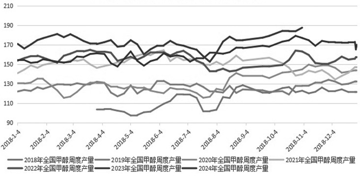 图为2018—2024年我国甲醇周度产量走势(单位:万吨) 美联储9月议息会议超预期降息50个基点,标志着其货币政策由紧缩周期转向宽松周期。虽然9月美国非农就业数据得到改善,通胀数据回落幅度不及预期,不过11月份美联储依然有望再度降息,数据显示,美国9月非农就业人数增加25.4万人,为2024年3月以来最大增幅。此外,美国9月失业率为4.1%,为2024年6月以来新低。今年9月美国CPI同比上涨2.4%,为2021年2月以来最低水平。9月核心CPI同比增长3.3%,较2022年9月峰值时期的6.6%已回落过半,仍高于市场预期。数据公布后,市场下调美联储11月降息50个基点的押注。预计美联储11月降息25个基点的概率升至76%,而不降息的概率升至24%,降息50个基点的概率则降至零。目前宏观驱动逻辑占据主导地位,换言之,在强预期背景下,弱现实暂时退居其次,从而驱动能化品种价格企稳反弹。 9月下旬以来,随着国内煤炭期货价格企稳反弹,成本支撑效应凸显,前期煤制甲醇装置检修结束重新复产以后,国内甲醇周度产量和开工率持续回升。据统计,截至2024年10月11日当周,国内甲醇平均开工率维持在81.77%,周环比略微回升0.83%,月环比小幅增长2.78%,较去年同期小幅增长5.52%。同期我国甲醇周度产量均值达187.68万吨,周环比小幅增加3.65万吨,月环比大幅增加8.42万吨,较去年同期的177.11万吨大幅增加10.57万吨。在国内甲醇企业供应压力增加的背景下,内陆库存累库压力不减反增。据统计,截至2024年10月10日当周,我国内陆甲醇库存合计达49.05万吨,周环比大幅增加5.36万吨,月环比小幅增加8.69万吨,较年初小幅增加5.82万吨,较去年同期的43.41万吨大幅增加5.64万吨。由此可见,目前国内甲醇供应压力依然存在,且维持稳步趋增的态势。