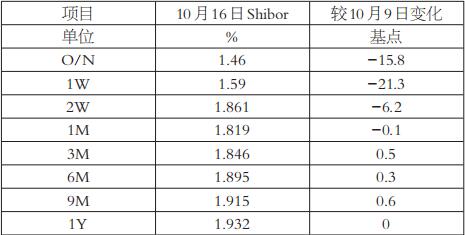 本周,国内市场利率整体呈现短弱长强态势。一方面,随着国庆假期和月中缴税缴款高峰的结束,资金需求下降,短端利率下行;另一方面,市场逐步消化降准影响,中长端利率稳中有升。截至10月16日,上海银行间同业拆放利率(Shibor)隔夜、1周期、2周期、1月期利率分别报收于1.46%、1.59%、1.861%、1.819%,较10月9日分别下降15.8、21.3、6.2、0.1个百分点;3月期、6月期、9月期利率分别报收于1.846%、1.895%、1.915%,较10月9日分别上升0.5、0.3、0.6个百分点;1年期利率报收于1.932%,与10月9日持平。