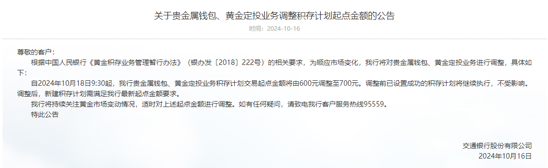 10月18日,黄金又创历史新高了! 沪金主力合约续创历史新高,截至早盘收盘,收于621.78元/克,较前一交易日收盘上涨1.47%。 外围市场上,纽约金走高,升破2700美元/盎司大关,创历史新高。 金饰价格已逼近800元/克大关,周大福、周六福、潮宏基18日公布的境内足金首饰价格为799元/克,再创新高。 ![]() 金价续创历史新高,原因是? 综合多家券商研报观点,具体利好有: 17日晚,美国人口调查局公布了美国9月零售销售数据,其中显示,美国9月零售销售环比增加0.4%,剔除汽车和汽油后零售额同比增长0.7%,均超出市场预期。华泰期货称,这增强了人们对美联储将在未来一年半内以较小步伐降息的预期。 欧洲央行再次降息,将存款机制利率从3.5%下调至3.25%,同时将主要再融资利率和边际贷款利率分别从3.65%和3.9%调整至3.4%和3.65%。福能期货表示,欧央行降息提振金价。 此外,银河期货首席策略师沈恩贤综合分析黄金多空因素称,当前利多因素主要有地缘政治冲突、美联储降息、美国大选不确定性、美债长期风险以及全球央行购金等,利空因素包括金银珠宝下游消费大幅走弱、黄金连续上涨多头有获利止盈倾向、中长期黄金供应增加等。 沈恩贤表示,根据以上这些因素再结合市场的情绪和预期,中期内黄金上涨趋势仍将延续。 不过,中信建投期货金属资深研究员对南财快讯记者表示,近期贵金属主线逻辑不甚清晰,美元走强,降息预期有所收敛,但贵金属价格仍在攀升,短期宜以观望为主。 至于黄金为何上涨?天风国际给出了一种解释。 该机构认为,在某种程度上,黄金上涨可以变相认为美元在过去一个季度里贬值4%—5%,实际美债收益率下降50—60基点。但实际上,它的势头已经超过了美元/实际美债收益率的增幅。或许黄金超跑可以理解为市场“贬值交易”的回归。 贬值交易泛指一系列黄金需求上升的交易,可以总结出这么几点驱动:1)2022年以来地缘冲突的高不确定性,2)长期通胀率的高不确定性,3)政府高债务,4)某些新兴市场国家法币信用下降,5)去美元化需求增加。 多家银行已上调积存金业务起点金额 随着黄金持续走高,包含黄金积存业务在内的银行贵金属业务受到投资者青睐。 据记者不完全统计,交通银行、光大银行、工商银行、中国银行、建设银行近日已上调积存金业务起点金额。 10月16日,交通银行发布公告称,自10月18日9:30起,交通银行贵金属钱包、黄金定投业务积存计划交易起点金额将由600元调整至700元。调整前已设置成功的积存计划将继续执行,不受影响。调整后,新建积存计划需满足交通银行最新起点金额要求。 ![]() 9月30日,光大银行发布公告称,自10月8日上午起,黄金积存个人业务定期投资按固定金额投资起购金额由600元调整为700元,追加金额维持100元整数倍不变。 9月28日,工商银行发布通告,10月1日起如意金积存业务最低投资额(即积存起点金额)由550元上调至650元,按克数积存的积存起点仍为1克。 9月26日,中国银行发布公告,将于9月27日调整积存金产品的购买条件,积存金起点金额将由600元调整为650元,追加购买金额维持200元整数倍不变。已在执行中的定投计划不受影响。 9月25日,建设银行发布公告称,9月27日9:10起,该行个人黄金积存业务定期积存起点金额(包括日均积存及自选日积存)将由600元上调至700元。 (声明:文章内容仅供参考,不构成投资建议。投资者据此操作,风险自担。) (文章来源:21世纪经济报道) (责任编辑:迷你学人) |