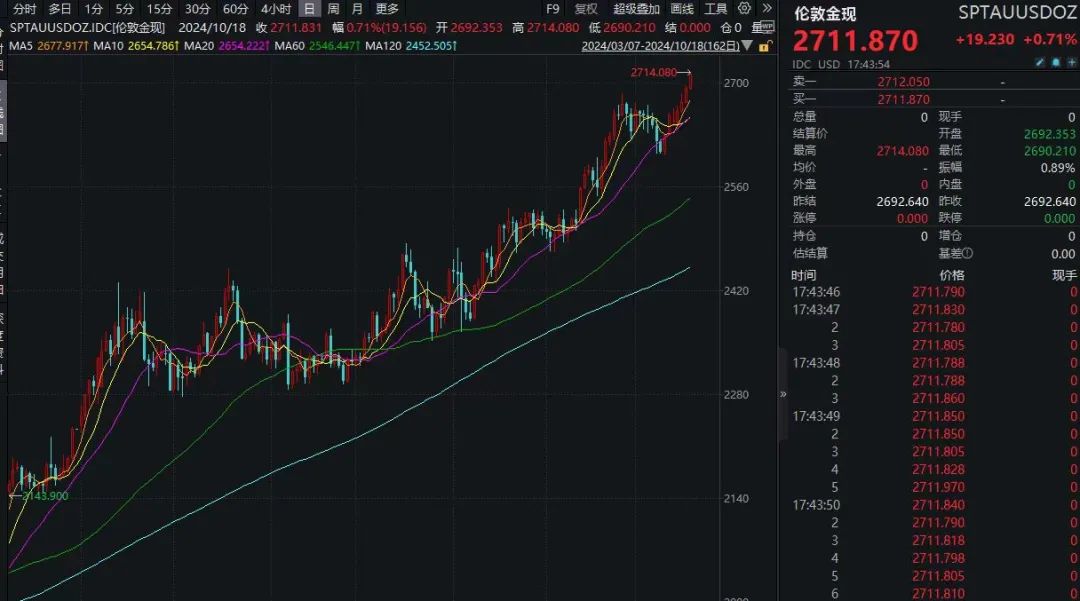 就在刚刚,朝鲜半岛又传来最新消息。 据央视新闻报道,当地时间10月18日,韩国总统尹锡悦主持召开紧急安保会议。韩国总统府称,韩方一直密切关注朝鲜向俄罗斯派兵的相关动向,未来将继续密切关注事态进展并积极采取措施应对。韩方称,朝鲜决定向俄罗斯派出4个旅团规模的特战部队士兵,规模为12000人。目前,朝鲜、俄罗斯方面对此暂无回应。 最近几天,中东紧张局势升级,以及朝鲜半岛局势升级,叠加美国总统大选的不确定性等因素,刺激黄金价格持续上涨。继10月17日创出新高后,10月18日黄金价格再度创下历史新高,现货黄金首次突破每盎司2700美元,最高触及2714美元/盎司。截至18日17点40分左右,现货黄金价格上涨0.71%报2711.87美元/盎司。 今年年初以来 ,黄金价格涨幅已经超过30%。接下来,黄金还有多大的上涨空间呢?