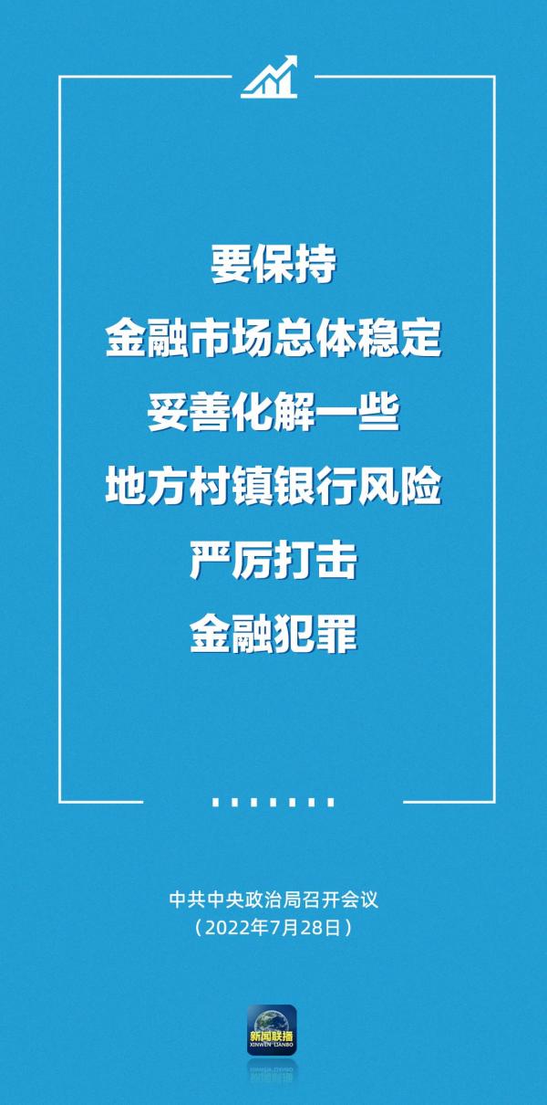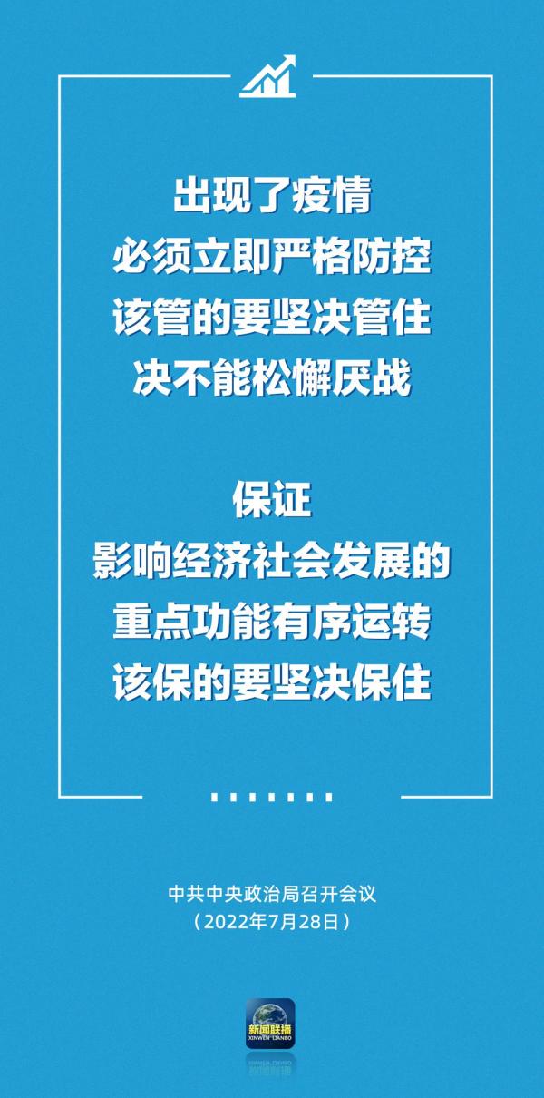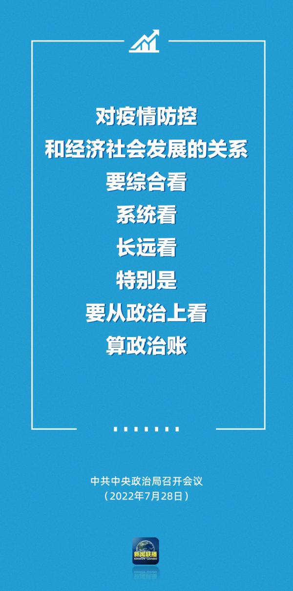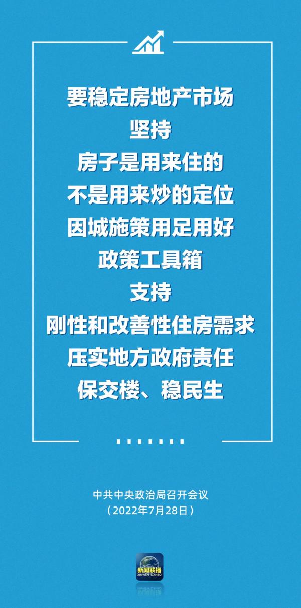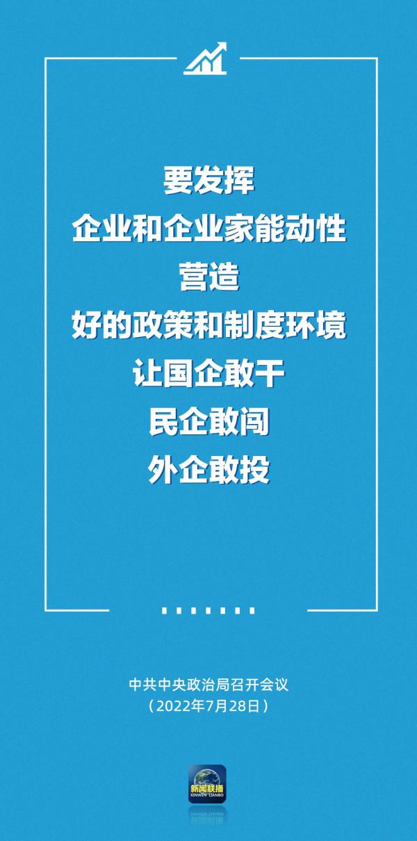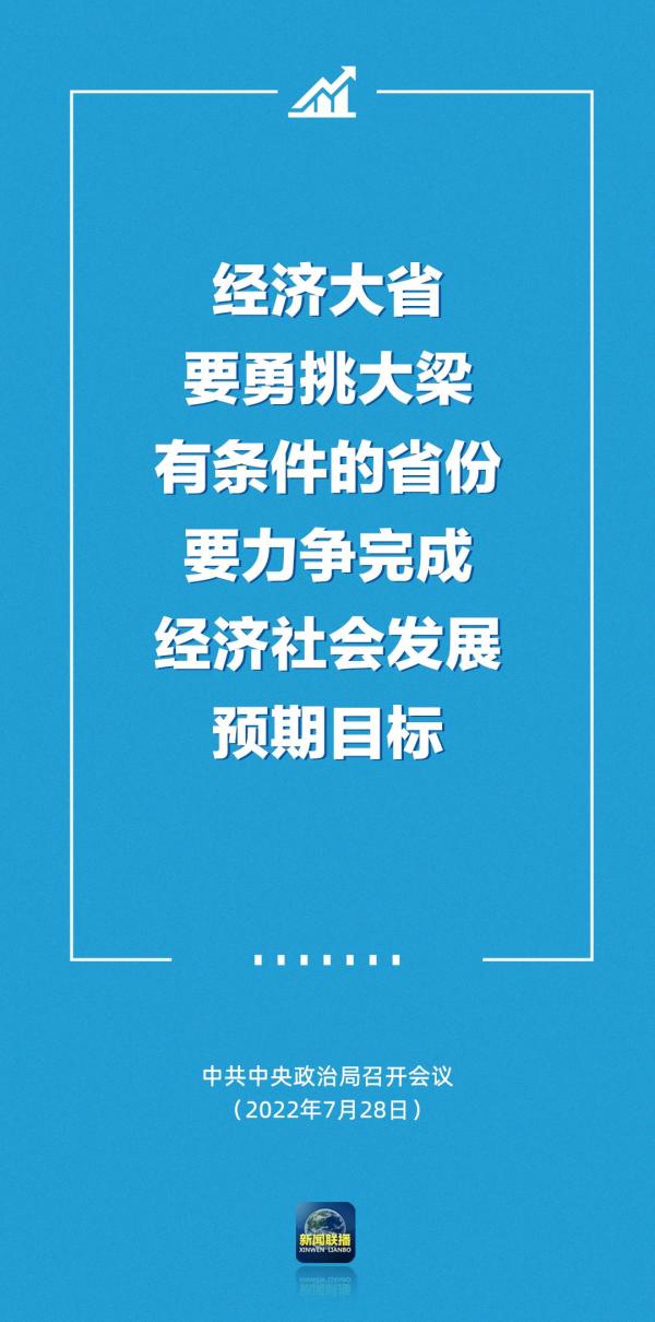 | 中共中央政治局7月28日召开会议,分析研究当前经济形势,部署下半年经济工作,审议《关于十九届中央第九轮巡视情况的综合报告》。中共中央总书记习近平主持会议。 经济工作 会议认为,今年以来,面对复杂严峻的国际环境和艰巨繁重的国内改革发展稳定任务,在以习近平同志为核心的党中央坚强领导下,我们有效统筹疫情防控和经济社会发展工作,疫情防控取得积极成效,经济社会发展取得新成绩。全国上下付出了艰辛努力,成绩值得充分肯定。同时,当前经济运行面临一些突出矛盾和问题,要保持战略定力,坚定做好自己的事。 ![]() 做好下半年经济工作总体要求 会议强调,做好下半年经济工作,要坚持稳中求进工作总基调,完整、准确、全面贯彻新发展理念,加快构建新发展格局,着力推动高质量发展,全面落实疫情要防住、经济要稳住、发展要安全的要求,巩固经济回升向好趋势,着力稳就业稳物价,保持经济运行在合理区间,力争实现最好结果。 统筹疫情防控和经济社会发展 会议指出,坚持就是胜利。要高效统筹疫情防控和经济社会发展工作。对疫情防控和经济社会发展的关系,要综合看、系统看、长远看,特别是要从政治上看、算政治账。要坚持人民至上、生命至上,坚持外防输入、内防反弹,坚持动态清零,出现了疫情必须立即严格防控,该管的要坚决管住,决不能松懈厌战。要坚决认真贯彻党中央确定的新冠肺炎防控政策举措,保证影响经济社会发展的重点功能有序运转,该保的要坚决保住。要做好病毒变异跟踪和新疫苗新药物研发。 ![]() ![]() 宏观政策 会议强调,宏观政策要在扩大需求上积极作为。财政货币政策要有效弥补社会需求不足。用好地方政府专项债券资金,支持地方政府用足用好专项债务限额。货币政策要保持流动性合理充裕,加大对企业的信贷支持,用好政策性银行新增信贷和基础设施建设投资基金。要提高产业链供应链稳定性和国际竞争力,畅通交通物流,优化国内产业链布局,支持中西部地区改善基础设施和营商环境。 守住安全底线 会议指出,要全方位守住安全底线。要强化粮食安全保障,提升能源资源供应保障能力,加大力度规划建设新能源供给消纳体系。要稳定房地产市场,坚持房子是用来住的、不是用来炒的定位,因城施策用足用好政策工具箱,支持刚性和改善性住房需求,压实地方政府责任,保交楼、稳民生。要保持金融市场总体稳定,妥善化解一些地方村镇银行风险,严厉打击金融犯罪。要压实安全生产责任。 ![]() ![]() 改革开放 会议指出,要以改革开放为经济发展增动力。要继续实施国企改革三年行动方案。要推动平台经济规范健康持续发展,完成平台经济专项整改,对平台经济实施常态化监管,集中推出一批“绿灯”投资案例。要积极促进出口、扩大进口,做好技术、外资引进工作,推动共建“一带一路”高质量发展。 ![]() 民生保障 会议强调,要扎实做好民生保障工作。要着力保障困难群众基本生活,做好高校毕业生等重点群体就业工作。 调动各方积极性 会议要求,要充分调动各方面积极性。各地区各部门要切实负起责任,各级领导班子要以饱满精神状态开展工作,领导干部要敢为善为。经济大省要勇挑大梁,有条件的省份要力争完成经济社会发展预期目标。要发挥企业和企业家能动性,营造好的政策和制度环境,让国企敢干、民企敢闯、外企敢投。 ![]() ![]() 巡视工作 会议指出,在以习近平同志为核心的党中央坚强领导下,巡视工作不断深化发展,十九届中央第九轮巡视集中巡视中央和国家机关,如期完成了党章规定的巡视全覆盖任务,凸显了我们党勇于自我革命的鲜明品格,体现了党内监督无例外的坚定立场。从巡视看,中央和国家机关不断增强“四个意识”、坚定“四个自信”、做到“两个维护”,呈现出认真负责、积极向上的良好状态,各项工作取得新成效。同时,巡视也发现了一些问题,要高度重视,认真抓好整改。 中央和国家机关要在巡视整改上发挥表率作用 会议强调,中央和国家机关要在巡视整改上发挥表率作用。 要加强政治建设,坚持不懈学懂弄通做实习近平新时代中国特色社会主义思想,不断提高政治判断力、政治领悟力、政治执行力,带头做到对党忠诚、对人民负责,坚决把党中央决策部署落到实处。 要坚持守正创新,增强政治能力和业务本领,主动适应新时代新要求,把握新时代工作规律,立足中华民族伟大复兴战略全局和世界百年未有之大变局,扎实履行职责使命。 要深入贯彻落实全面深化改革部署,做到系统集成、协同高效,不断推进国家治理体系和治理能力现代化。 要统筹发展和安全,坚持总体国家安全观,切实扛起防范化解风险的政治责任,牢固树立底线思维,提高对重大风险的预见、应对、处置能力。 要保持战略定力,坚决贯彻严的主基调,认真落实全面从严治党“两个责任”,强化第一责任人责任,层层传导压力,健全内部管理和权力运行监督制约机制,一体推进不敢腐、不能腐、不想腐。 要深入贯彻新时代党的组织路线,不断加强领导班子建设、干部人才队伍建设和基层党组织建设。要综合用好巡视成果,深化标本兼治,促进完善体制机制,不断提升中央和国家机关工作能力和水平。 会议还研究了其他事项。 分析解读政治局会议释放6大信号:经济运行要力争实现最好结果 下半年楼市怎么走? 