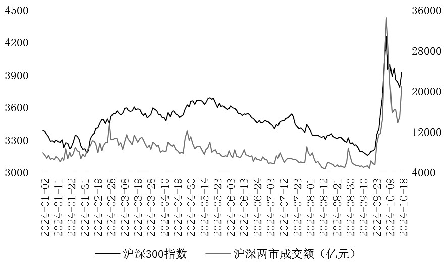 图为上证综指与沪深两市成交额 经济数据边际好转 上周五,国家统计局发布三季度及9月经济数据。数据显示,三季度GDP实际同比增长4.6%。9月规模以上工业增加值同比实际增长5.4%,较8月回升0.9%,显示国内工业生产扩张趋稳。9月固定资产投资累计同比增长3.4%,与上月持平。其中,制造业和房地产投资增速均回升0.1%;基建投资(不含电力)增速回落0.3%,至4.1%,是制约固定资产投资增速回升的主要因素。9月社会消费品零售总额同比增长3.2%,回升1.1个百分点,增速有所改善。在“以旧换新”政策的推动下,9月商品零售同比增长3.3%,回升1.4个百分点,是9月消费回升的主要驱动。 整体来看,国家统计局公布的经济数据要好于此前市场的预期。但对于良好的经济数据,投资者的态度存在一定分歧。然而,央行行长潘功胜的讲话,强化了投资者对经济数据强劲叠加宽松政策持续的预期,极大地提振了市场情绪。 政策红利持续不断 上周五,政策面暖风频吹。央行行长潘功胜在2024金融街论坛年会上表示,9月27日已下调存款准备金率0.5个百分点,预计年底前视市场流动性情况,择机进一步下调存款准备金率0.25~0.5个百分点。10月18日早上,商业银行已经公布下调存款利率,预计下周一(10月21日)公布的贷款市场报价利率(LPR)也会下行0.2~0.25个百分点。潘行长强调,将把促进物价合理回升作为重要考量,更加注重发挥利率等价格型调控工具的作用。此外,《关于做好证券、基金、保险公司互换便利(SFISF)相关工作的通知》和《关于设立股票回购增持再贷款有关事宜的通知》也于当日正式发布。目前获准参与互换便利操作的证券、基金公司有20家,首批申请额度已超2000亿元,可大幅提升非银机构融资能力,持续为股市带来增量资金。再贷款首期额度3000亿元,适用于不同所有制上市公司。21家全国性金融机构可发放股票回购增持贷款,贷款利率原则上不超过2.25%。值得注意的是,央行提供股票回购、增持再贷款有特定指向性,信贷资金不能违规进入股市是底线。潘行长的表态,向市场传递了相对宽松货币延续的信号以及政策面打破通缩的决心。而2000亿元SFISF和3000亿元再贷款的正式设立,意味着股票市场增量资金可期。 笔者认为,国庆假期前后A股市场的波动,实质上源自投资者对财政政策的预期出现摆动,上周A股依然受政策预期左右。因为政策传导至经济需要一定时间,当前投资者关注的重心是政策红利的释放是否具有持续性、是否一直好于市场预期。 从时间维度来看,10月12日财政部发布会标志着财政政策基调的转变。在扩张性财政政策方向已定的基础上,后续政策细节将陆续出台,从现在起到明年全国两会期间都可以视作财政政策的窗口期,最近的一个时间节点就是10月下旬即将召开的全国人大常委会会议。海外方面,11月5日将举行美国大选投票,11月6日至7日美联储将举行议息会议,上述事件的结果可能影响国内宏观政策出台的节奏,建议投资者密切关注。操作上,政策面是影响短期市场节奏的关键,这就会导致指数跟随消息进行波动。建议投资者在持有部分多单底仓的同时,留出部分仓位进行滚动操作、高抛低吸,关注两市成交额的变化。笔者预计,只要政策基调不变,相关措施结合国内外情况稳步推进,A股就有望走出类似2016年至2017年震荡上行的走势。