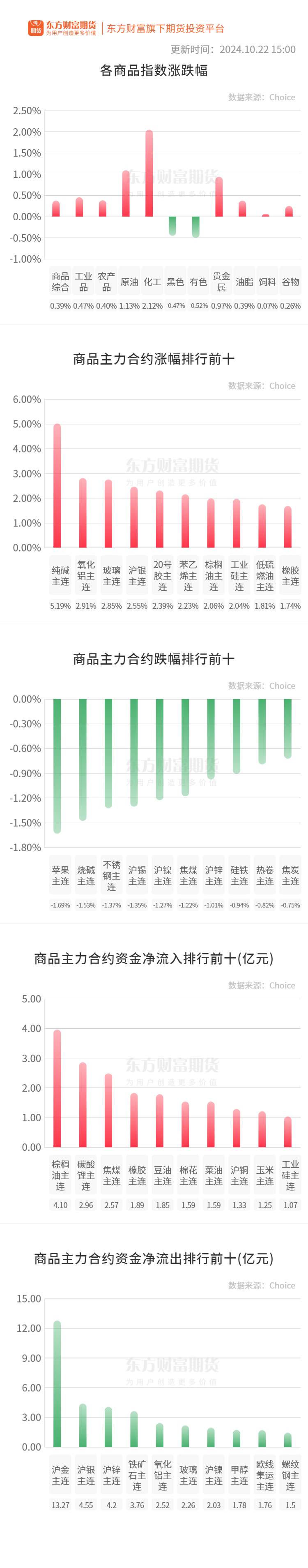行情纵览![]() 宏观要闻财联社:国家外汇局今日在国新办新闻发布会上介绍,近期外资配置人民币资产呈现良好势头,未来还有进一步增配的空间。我国经济基本面稳中向好,提供了良好的宏观环境;我国完善高水平开放,提供了良好的政策环境;人民币资产具有分散风险的多元配置效果,提供了良好的投资价值。 财联社:央行今日进行1584亿元7天期逆回购操作,中标利率为1.50%,与此前持平。 品种资讯黑色系期货 钢材:10月22日,山西中阳建材价格调整如下:1、线材价格下调20元,现Q195出厂价3420元/吨;2、螺纹钢价格下调100元,现HRB400EΦ18-25mm出厂价3400元/吨;3、盘螺价格下调50元,现HR400EΦ8-10mm出厂价3350元/吨。(西本新干线) 焦炭:10月22日唐山市场部分钢厂计划对湿熄焦炭价格下调50元/吨、干熄焦下调55元/吨,2024年10月23日0时起执行;邢台地区部分钢厂对湿熄焦炭下调50元/吨、干熄焦炭下调55元/吨,2024年10月23日零点执行。(Mysteel) 铁矿石:卫星数据显示,2024年10月14日-10月20日期间,澳大利亚、巴西七个主要港口铁矿石库存总量1161.0万吨,环比上升28.6万吨,库存连续两期累库,目前库存绝对量仍低于今年以来的均值。 10月22日Mysteel统计中国47港进口铁矿石库存总量15930.11万吨,较上周一增加41.51万吨;45港库存总量15258.11万吨,环比增加79.51万吨。(Mysteel) 农产品期货 大豆:美国农业部在每周作物生长报告中公布称,截至2024年10月20日当周,美国大豆收割率为81%,符合市场预期,前一周为67%,去年同期为72%,五年均值为67%。(新华财经) 鸡蛋:截至21日,主产区鸡蛋均价为4.76元/斤,较上一日涨幅0.63%。目前红蛋市场走货顺畅,粉蛋市场走货稍缓,少数地区根据实际走货情况涨跌调整,但幅度均有限。(卓创资讯) 生猪:截至10月22日14:00时,全国农产品批发市场猪肉平均价格为24.58元/公斤,比昨天下降1.0%。(农业农村部) 有色/贵金属期货 沪铜:国际铜业研究组织(ICSG)在报告中称,2024年8月,全球精炼铜市场供应过剩5.4万吨,此前在7月过剩7.3万吨。1—8月,市场供应过剩53.5万吨,去年同期为过剩7.5万吨。(新华财经) 碳酸锂:上海钢联发布数据显示,10月22日电池级碳酸锂价格较上一日下跌500元,均价报7.15万元/吨。(新华财经) 沪镍:受近期菲律宾天气因素影响,菲律宾红土镍矿装船发运效率出现一定的延缓,预计周内菲律宾主要矿区的到港及开航的船只数量将出现下降。(上海有色网) 能化期货 尿素:10月22日尿素行情涨跌互现,部分地区调整幅度10-20元/吨左右。(农时达情报) 原油:商务部发布2025年原油非国营贸易进口允许量总量、申请条件和申请程序,2025年原油非国营贸易进口允许量为25700万吨。2024年底前将第一批允许量下达给符合条件的企业。其后根据企业实际进口情况、经营需求和新增合法产能情况适时追加和调整。近2年无进口业绩的企业不再安排允许量。地方申请企业须向所在地省级商务主管部门提出申请,中央企业的子公司须通过集团总部统一申请。(财联社) PTA:截至10月21日上午,PTA市场主流商谈区间在4900-4955元/吨,价格较上一交易日上涨63元/吨。但是由于PTA加工费较高,PTA产能运行率高位运行。(卓创资讯) 晚间关注无 (文章来源:东方财富研究中心) (责任编辑:迷你学人) |