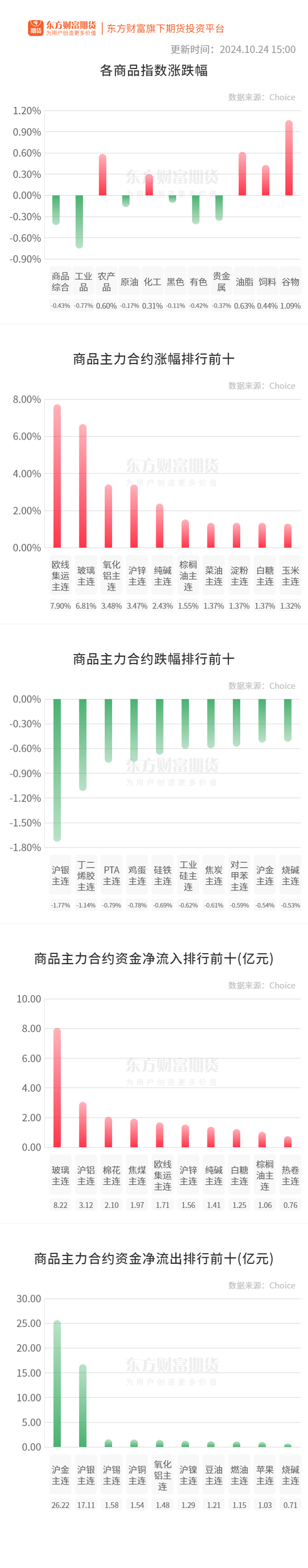 行情纵览![]() 宏观要闻广州日报:在LPR超预期大幅下降25个基点后,全国多地商业银行房贷利率将步入“2”时代。10月24日,广州日报全媒体记者调查广州多家银行发现,目前广州房贷利率整体下降,首套房贷主流利率为2.85%~2.9%,部分银行的房贷利率甚至低于公积金利率。不过,有业内人士透露,银行接到要求,房贷利率不得低于公积金贷款利率。 财联社:央行今日进行7989亿元7天期逆回购操作,中标利率为1.50%,与此前持平。 品种资讯黑色系期货 钢材:10月中旬,21个城市5大品种钢材社会库存731万吨,环比减少32万吨,下降4.2%;比年初增加2万吨,上升0.3%;比上年同期减少169万吨,下降18.8%。10月中旬,螺纹钢库存244万吨,环比减少17万吨,下降6.5%,库存转升后再次下降;比年初减少61万吨,下降20.0%;比上年同期减少117万吨,下降32.4%。(中国钢铁工业协会) 10月24日,六安钢铁建材价格调整如下:1、螺纹钢下跌30元/吨 ,现Φ18mmHRB400E螺纹钢挂牌价格3580元/吨;2、盘螺下跌30元/吨 ,现Φ8-10mmHRB400E盘螺挂牌价格3670元/吨;3、线材下跌30元/吨 ,现Φ8-12mmHPB300线材挂牌价格3630元/吨。(西本新干线) 截至10月24日当周,螺纹钢产量连续第九周增加,社库连续第三周下降,厂库连续第四周增加,表需由增转降。(Mysteel) 铁矿石:截至10月24日,新口径114家钢厂进口烧结粉总库存2599.16万吨,环比上期增65.68万吨;进口烧结粉总日耗115.66万吨,降0.63万吨;剔除长期停产样本后不含税铁水成本2603元/吨,降2元/吨。(Mysteel) 农产品期货 生猪:截至24日14:00时,全国农产品批发市场猪肉平均价格为24.83元/公斤,比昨天上升0.5%。(农业农村部) 棕榈油:据马来西亚棕榈油协会(MPOA)发布的数据,马来西亚10月1-20日棕榈油产量预估减少0.81%,其中马来半岛减少4.88%,沙巴增加12.02%,沙捞越减少4.15%,马来东部增加6.41%。(新华财经) 淀粉:截至10月23日,全国玉米淀粉企业淀粉库存总量79.5万吨,较上周下降2.10万吨,周降幅2.57%,月降幅10.07%;年同比增幅35.90%。(Mysteel) 有色/贵金属期货 沪铜:10月24日国内市场电解铜现货库存21.70万吨,较17日降0.39万吨,较21日增0.14万吨;上海库存15.40万吨,较17日增0.72万吨,较21日增0.64万吨;广东库存3.86万吨,较17日降0.93万吨,较21日降0.39万吨;江苏库存1.84万吨,较17日降0.15万吨,较21日降0.01万吨。(Mysteel) 碳酸锂:截至10月23日,工碳、电碳分别收于70000、71500元/吨,分别较上周同期下跌2500、2000元/吨。本周现货市场买盘刚需入市商谈11月订单,带动供方挺价情绪,但由于产业链中下游环节议价能力强,且业者对于后市预期偏空,市场价格重心僵持下移。(卓创资讯) 能化期货 玻璃:截止到10月24日,全国浮法玻璃样本企业总库存5694.1万重箱,环比下降89.4万重箱或1.55%,连降四周创8个月新低,同比增加40.05%,折库存天数26.1天,较上期下降0.3天。(隆众资讯) 纯碱:截至10月24日,本周国内纯碱厂家总库存165.03万吨,环比上周增加4.9万吨,涨幅3.06%。较周一增加1.91万吨,涨幅1.17%。其中,轻质纯碱69.99万吨,环比增加0.22万吨,重质纯碱95.04万吨,环比增加1.69万吨。(隆众资讯) 烧碱:截至2024年10月24日,全国20万吨及以上液碱样本企业厂库库存30.07万吨(湿吨),环比下调15.13%,同比下滑26.56%。(隆众资讯) 晚间关注20:30 美国:当周首次申请失业金人数 (文章来源:东方财富研究中心) (责任编辑:迷你学人) |
