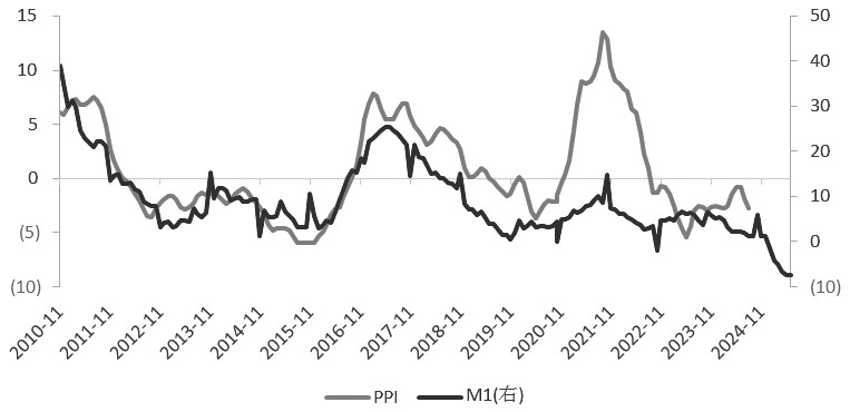图为库存周期运行情况 第二,关注PMI指数景气度和库存周期的实际补库情况。经济复苏期通常对应主动补库周期,主动补库时期A股呈现明显的上涨行情。目前制造业PMI指数待扩张,企业供需偏弱、利润仍然维持负增长,库存周期表现分化,营业收入同比下滑,产成品存货小幅抬升,属于被动去库的可能性较大。需要关注PMI后续是否重回荣枯线上方,以及维持扩张的持续性,关注经济动能(新订单—产成品库存)和企业利润(出厂价格—原材料购进价格)改善情况。 第三,关注物价指数是否温和回升。除关注信用需求的修复、生产端的扩张之外,需求端的表现能更好佐证内需改善的持续性。目前通胀持续走弱、通缩压力依旧,M1(流通中的现金+企业活期存款)对PPI具有领先作用,若M1止跌回升,逐渐传导至核心CPI和PPI,改善通缩预期。后续一方面关注就业和收入的改善,股市和楼市的财富效应,另一方面关注物价指数是否温和回升,若信用周期、库存周期以及通货膨胀温和回升三方面的数据共振,则表明经济复苏和活力明显增强,对持续性的牛市才会形成支撑。