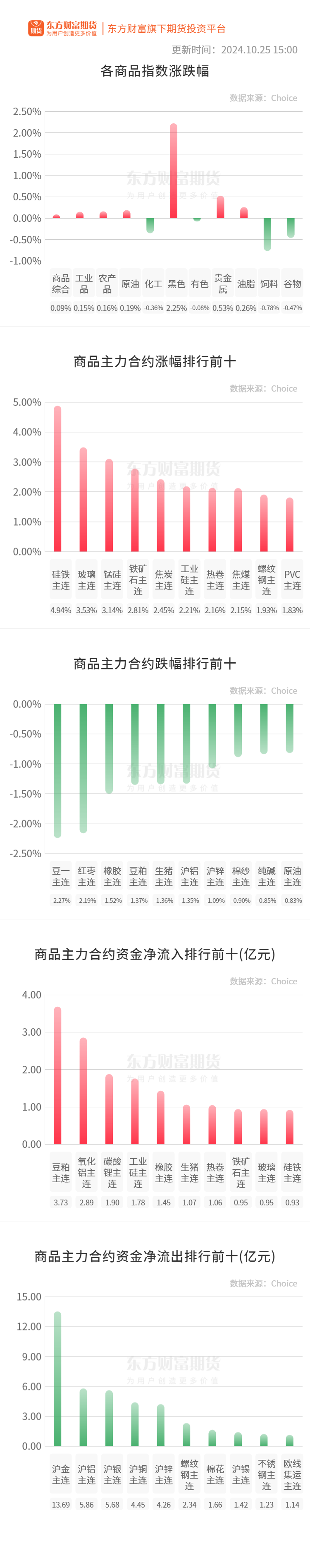行情纵览![]() 宏观要闻新华社:从人力资源社会保障部召开的新闻发布会上获悉,前三季度,一揽子援企稳岗政策已释放红利超1500亿元,持续支持企业稳岗位促发展。具体包括:将降低失业保险费率至1%的政策延续至2025年底,对不裁员少裁员的参保企业继续实施稳岗返还政策至2024年底,对劳动者延续实施技能提升补贴政策至2024年底等。 界面新闻:中国人民银行10月25日公告,开展7000亿元中期借贷便利(MLF)操作,期限1年,最高投标利率2.30%,最低投标利率1.90%,中标利率2.00%。 央行网站:经国务院批准,中国人民银行与日本银行近日续签双边本币互换协议,互换规模保持不变,为2000亿元人民币/34000亿日元,协议有效期三年,经双方同意可以展期。 品种资讯黑色系期货 钢材:247家钢厂高炉开工率82.14%,环比上周增加0.46个百分点,同比去年减少0.35个百分点;高炉炼铁产能利用率88.48%,环比增加0.49个百分点,同比减少2.25个百分点;钢厂盈利率64.94%,环比减少9.52个百分点,同比增加48.49个百分点;日均铁水产量235.69万吨,环比增加1.33万吨,同比减少7.04万吨。(Mysteel) 铁矿石:全国45个港口进口铁矿石库存总量15341.68万吨,环比增44.15万吨,45港日均疏港量323.34万吨,环比降2.56万吨。 全国钢厂进口铁矿石库存总量为8978.91万吨,环比减少27.82 万吨;当前样本钢厂的进口矿日耗为290.84万吨,环比增加1.92万吨 ,库存消费比30.87 ,环比减少0.30天。(Mysteel) 煤炭:截至10月25日当周,统计独立焦企全样本产能利用率为73.96%,减0.28%;焦炭日均产量66.87万吨,减0.26万吨;焦炭库存77.89万吨,增5.78万吨;炼焦煤总库存923.29万吨,减34.17万吨;焦煤可用天数10.4天,减0.34天。(Mysteel) 农产品期货 棕榈油:据船运调查机构ITS数据显示,马来西亚10月1-25日棕榈油出口量为1322325吨,较上月同期出口的1193471吨增加10.8%。 据马来西亚独立检验机构AmSpec,马来西亚10月1-25日棕榈油出口量为1260033吨,较上月同期出口的1148592吨增加9.7%。(新华财经) 生猪:截至10月25日14:00时,全国农产品批发市场猪肉平均价格为24.67元/公斤,比昨天下降0.6%。(农业农村部) 有色/贵金属期货 碳酸锂:上海钢联发布数据显示,10月25日电池级碳酸锂价格较上日上涨1000元,均价报7.25万元/吨。(财联社) 氧化铝:截至本周四(2024/10/24)全国氧化铝产能利用率为87.02%,较上周下降1个百分点,本周氧化铝产能利用率下降。主因是受各地区重污染天气预警影响,北方部分氧化铝厂被迫停炉压产,短期产量有所缩减。另外,西南部分氧化铝厂焙烧炉进行检修,涉及产能约80万吨/年,实际对产量影响有限。(Mysteel) 能化期货原油:高盛集团分析师Daan Struyven等在报告中表示,在中国近期出台一揽子刺激计划后,经济增长前景改善,可能会给石油需求带来10万桶/日的提振,到2025年末将油价推高1-2美元/桶。(财联社) 尿素:25日尿素行情大稳小动,部分地区调整幅度10-20元/吨左右。(农时达情报) 晚间关注无 (文章来源:东方财富研究中心) (责任编辑:迷你学人) |