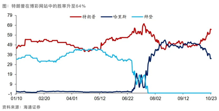 特朗普胜率提高 据国泰君安最新研报梳理的数据,截至10月24日,民调数据显示,特朗普的全口径支持率落后哈里斯0.9%,但在关键摇摆州,特朗普的支持率领先哈里斯0.9%。选举人票方面,共和党目前拥有219票,落后于民主党的226票。不过,根据Polymarket的预测,共和党有望赢取全面胜利。 但据最新的博彩数据,截至10月23日,特朗普的支持率再次超过哈里斯,目前胜率已经达到了64%,而哈里斯仅在40%左右。 ![]() 后续关键时间节点包括,11月5日的美国总统普选和12月17日的选举人团投票。历史上,美国总统的普选结果与选举人团结果不一致的情况曾出现5次,分别在1824年、1876年、1888年、2000年和2016年,发生的概率约为10%。 国泰君安的最新报告指出,在2024年美国大选中,共和党政策强调“少税收、少支出、少监管”,核心理念包括减少政府干预、维护国家安全和传统价值观、释放能源产量、降低能源价格、削减不必要的政府开支、放松监管、试图全面减税,以及推行“美国优先”的贸易政策。 与此相对,民主党政策主张“多税收、多支出、多监管”,强调通过增加政府监管、促进社会公平和多元文化来推动经济发展,并计划通过增加对富人和大企业的税收来支持财政支出。其贸易政策更强调与盟友的合作,并避免与主要经济体完全脱钩。 国泰君安称,为争取更多选票,特朗普和哈里斯逐步调整其政策立场,向中间靠拢。两者在减税、移民控制、能源独立、通胀控制等议题上存在部分共识,但在具体措施上有显著分歧。市场预期特朗普政策倾向于美国“经济增长+再通胀”,而哈里斯政策则倾向于“经济增长中性偏负+再通胀中性”。 国泰君安认为,在美联储降息周期的背景下,市场当前对美国再通胀风险尤为敏感。 中金公司发布研究报告称,备受瞩目的2024年美国总统大选结果将在短短两周内揭晓,此次选举异常胶着,出现了特朗普遇刺、民主党临时换帅等罕见事件,选举结果受这些事件影响多次逆转。根据民调和投注赔率,特朗普最近再次领先。 中金公司表示,随着选民情绪的变化,与大选政策密切相关的金融资产自9月底以来大多向“特朗普胜选交易”转移。对资产而言,无论是“共和党胜选”还是“特朗普+民主党入主众议院”情景,均更有可能导致美债利率上升、美元走强。区别在于,“共和党全胜”情景下,经济增长更好,美股收益将获得更大提振,美债利率也可能出现更大上涨。 (文章来源:证券时报) (责任编辑:迷你学人) |